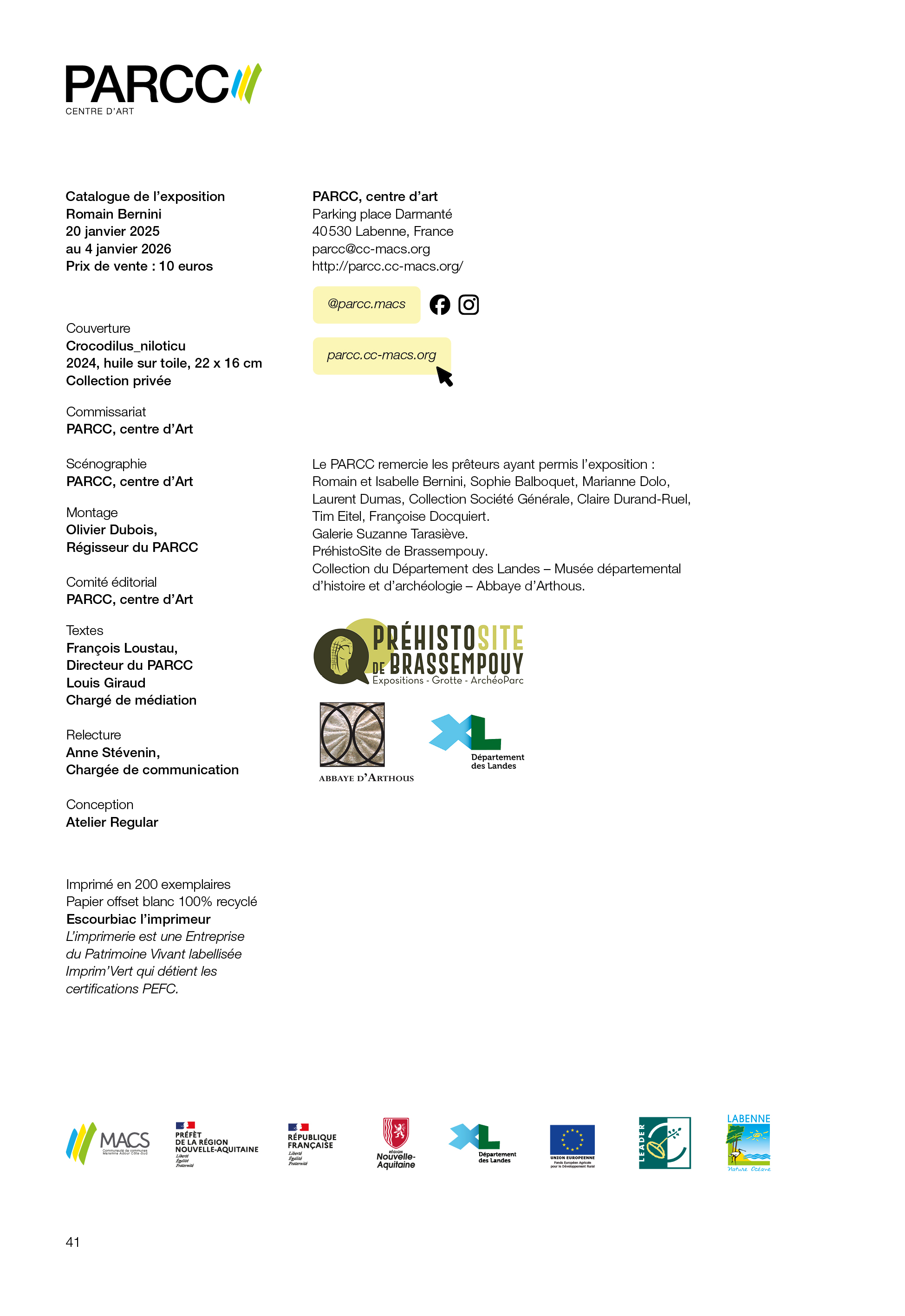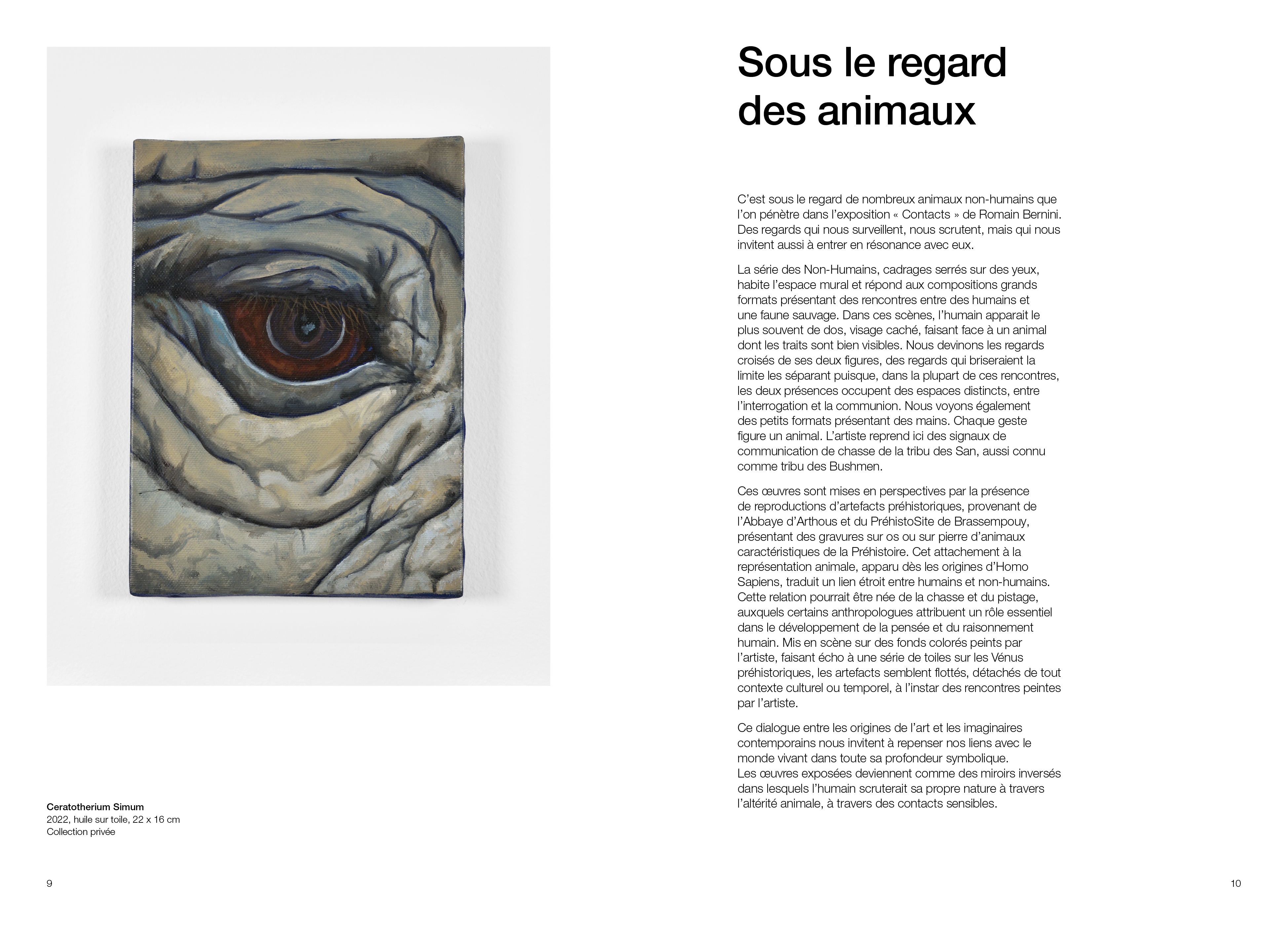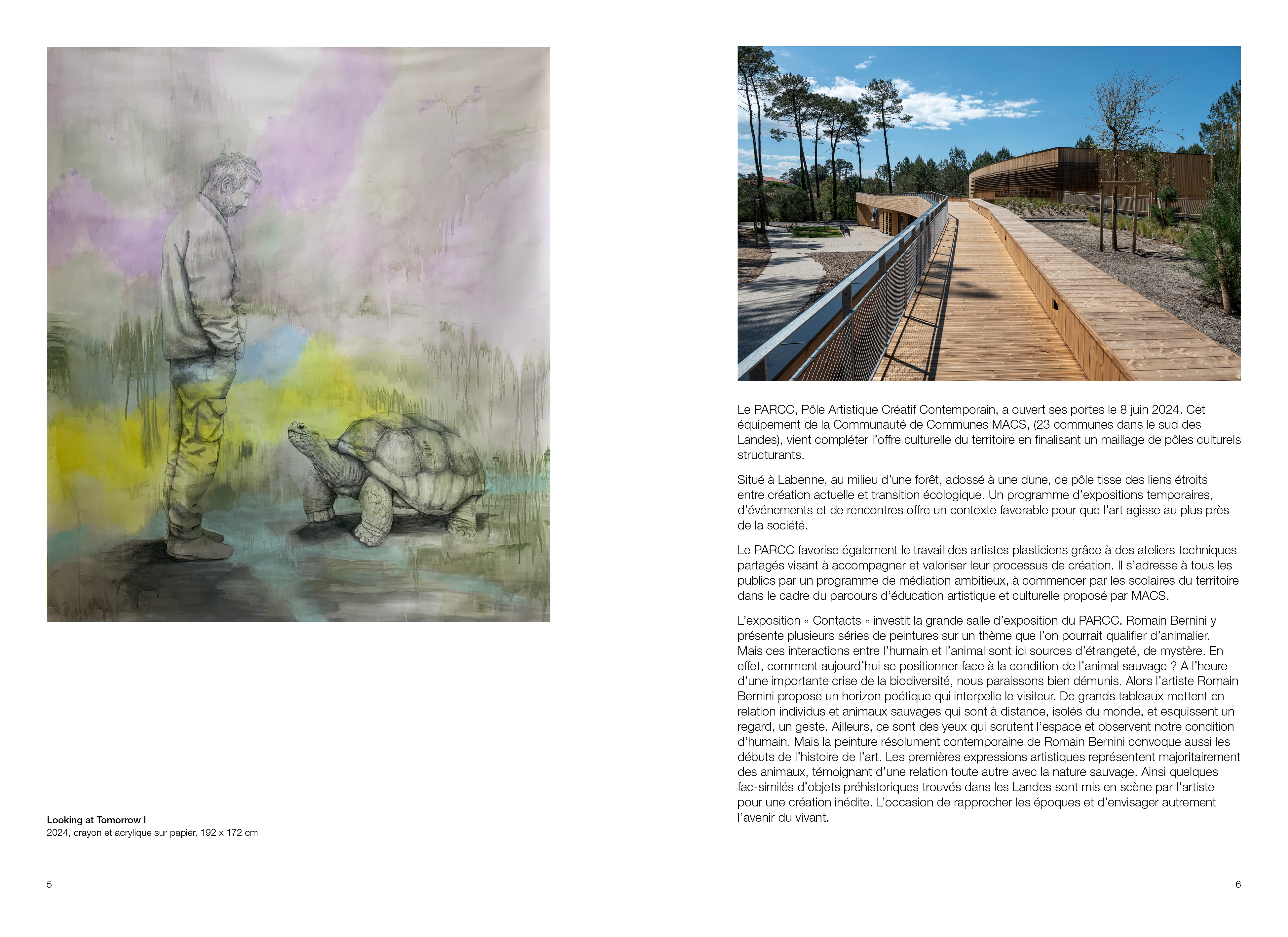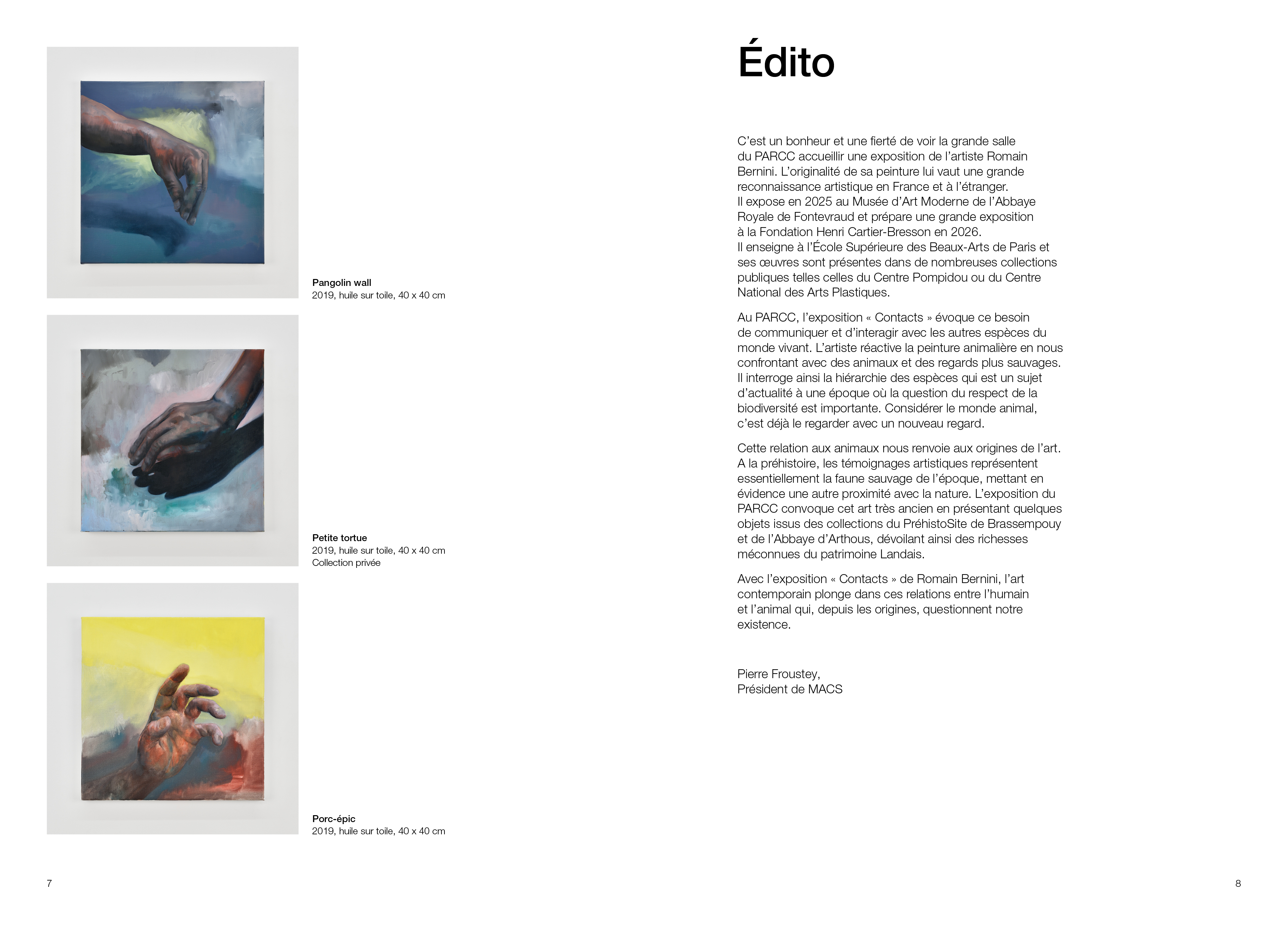 L’exposition « Contacts » investit la grande salle d’exposition du PARCC. Romain Bernini y présente plusieurs séries de peintures sur un thème que l’on pourrait qualifier d’animalier. Mais ces interactions entre l’humain et l’animal sont ici sources d’étrangeté, de mystère. En effet, comment aujourd’hui se positionner face à la condition de l’animal sauvage ? A l’heure d’une importante crise de la biodiversité, nous paraissons bien démunis. Alors l’artiste Romain Bernini propose un horizon poétique qui interpelle le visiteur.
