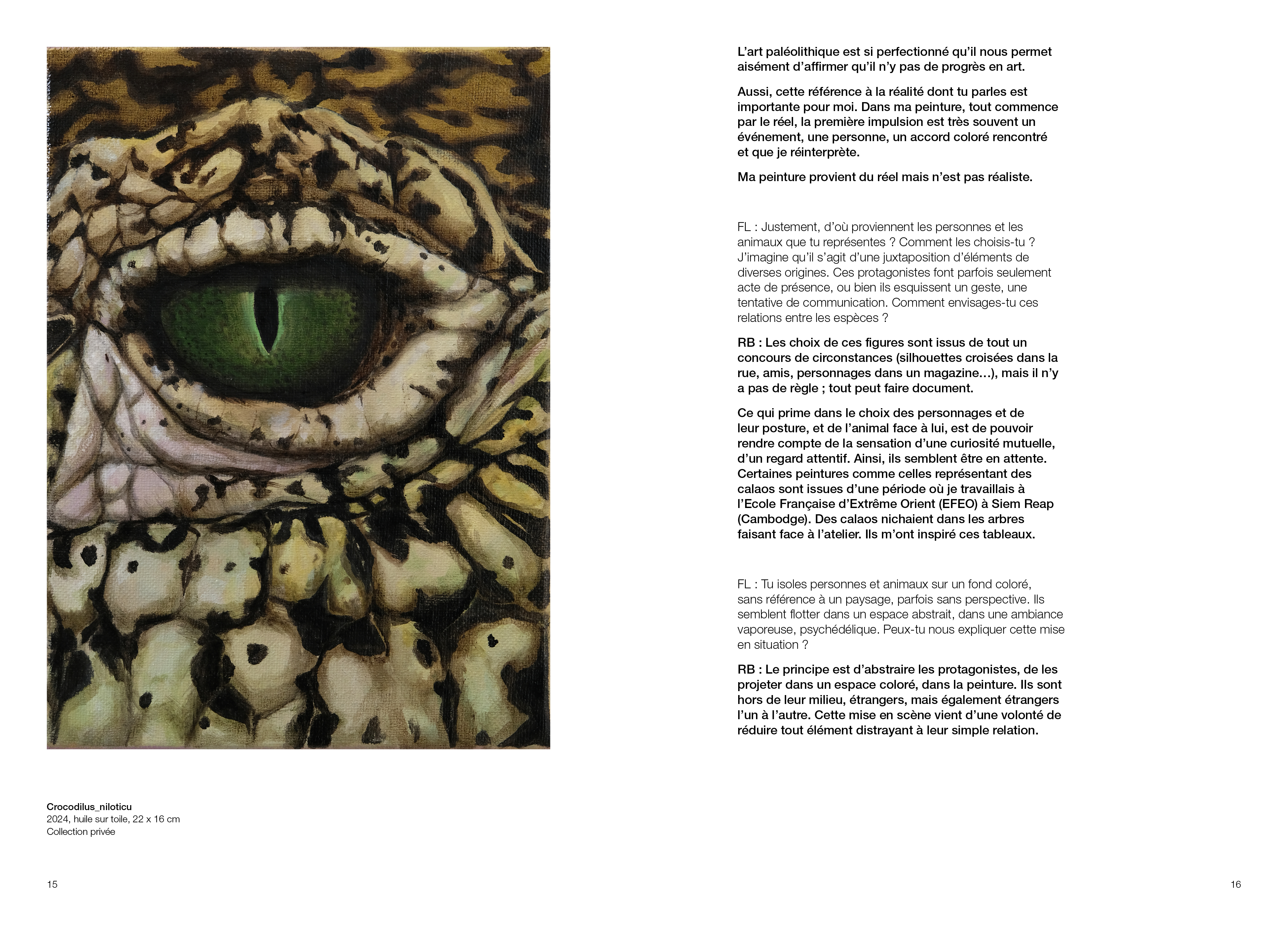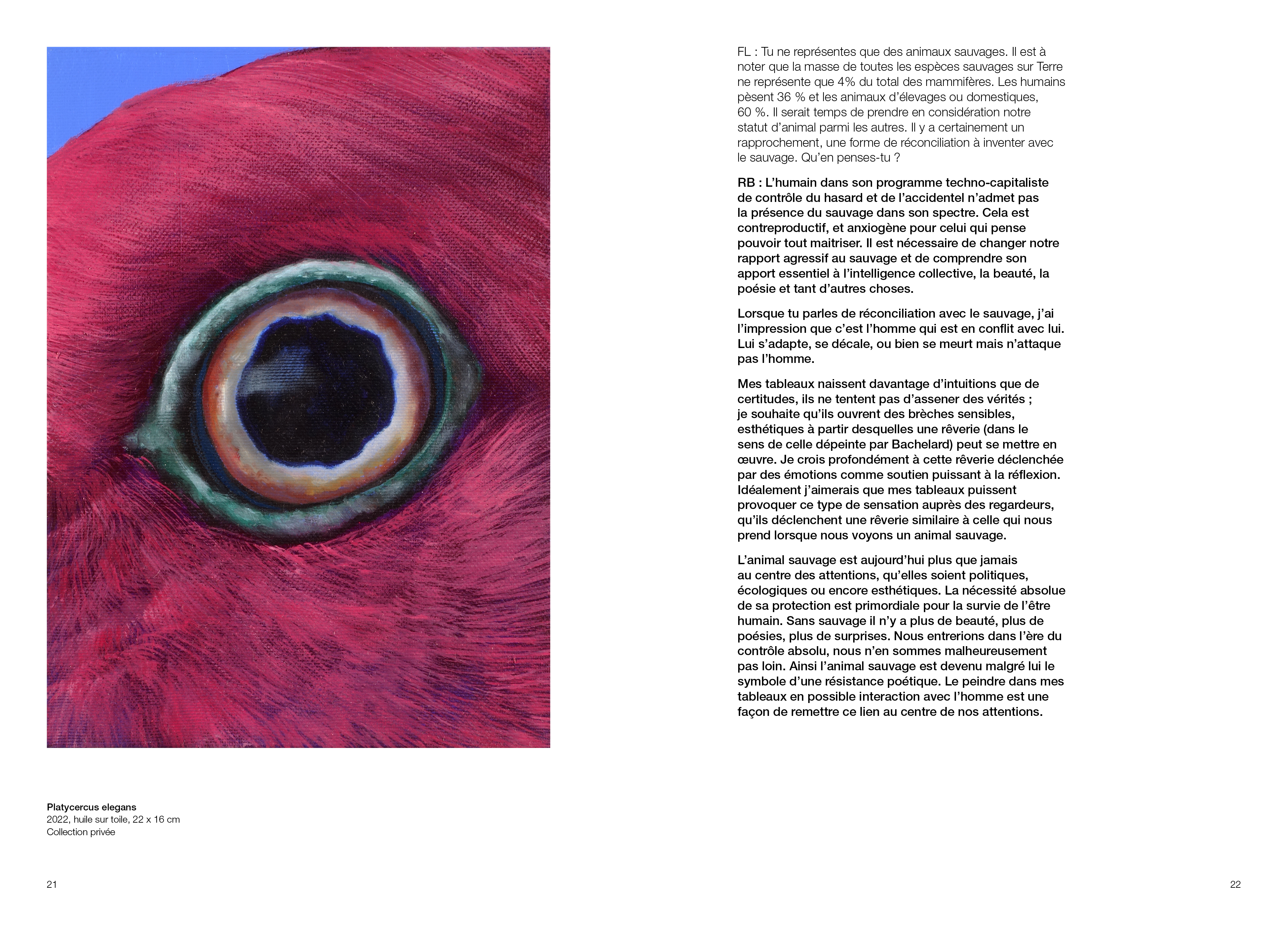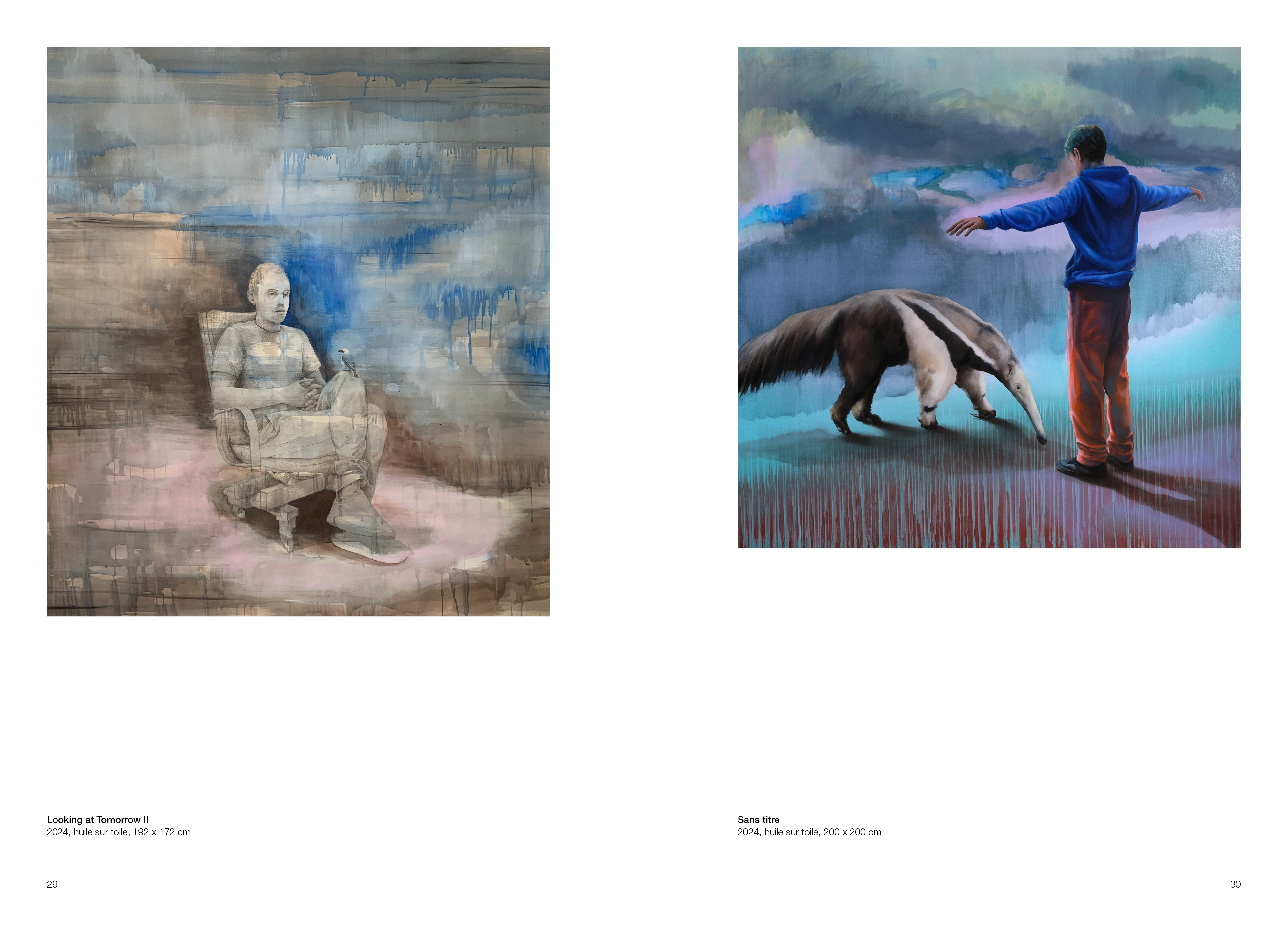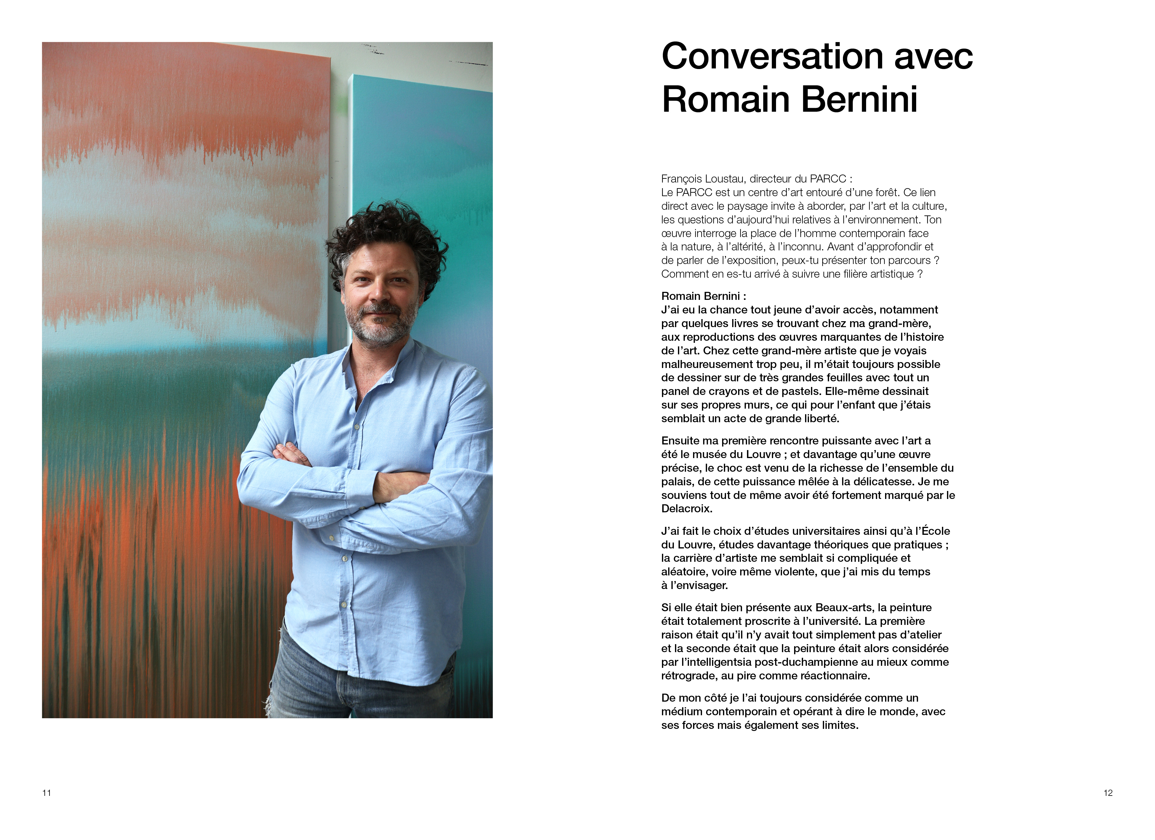 L’exposition « Contacts » investit la grande salle d’exposition du PARCC. Romain Bernini y présente plusieurs séries de peintures sur un thème que l’on pourrait qualifier d’animalier. Mais ces interactions entre l’humain et l’animal sont ici sources d’étrangeté, de mystère. En effet, comment aujourd’hui se positionner face à la condition de l’animal sauvage ? A l’heure d’une importante crise de la biodiversité, nous paraissons bien démunis. Alors l’artiste Romain Bernini propose un horizon poétique qui interpelle le visiteur.