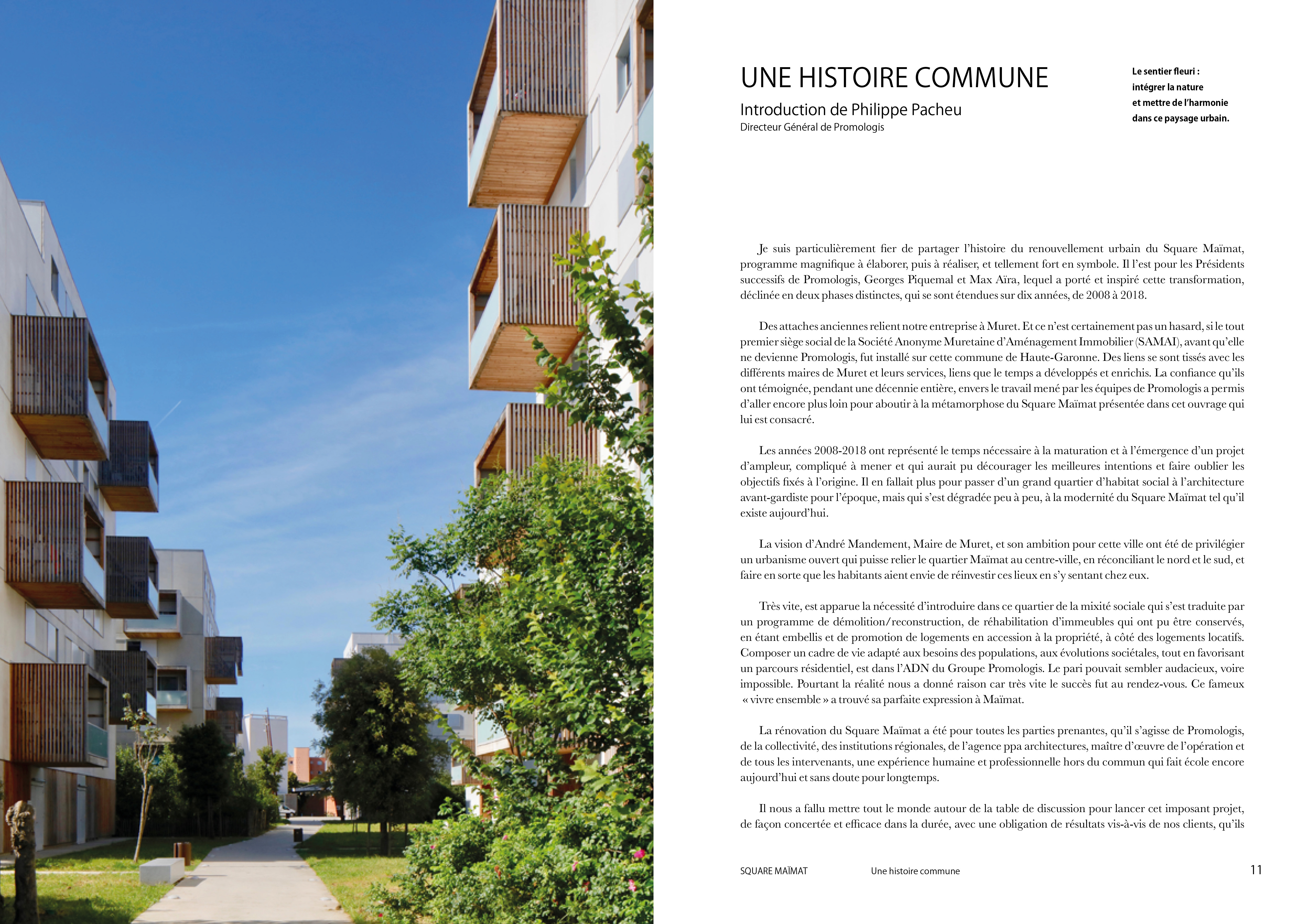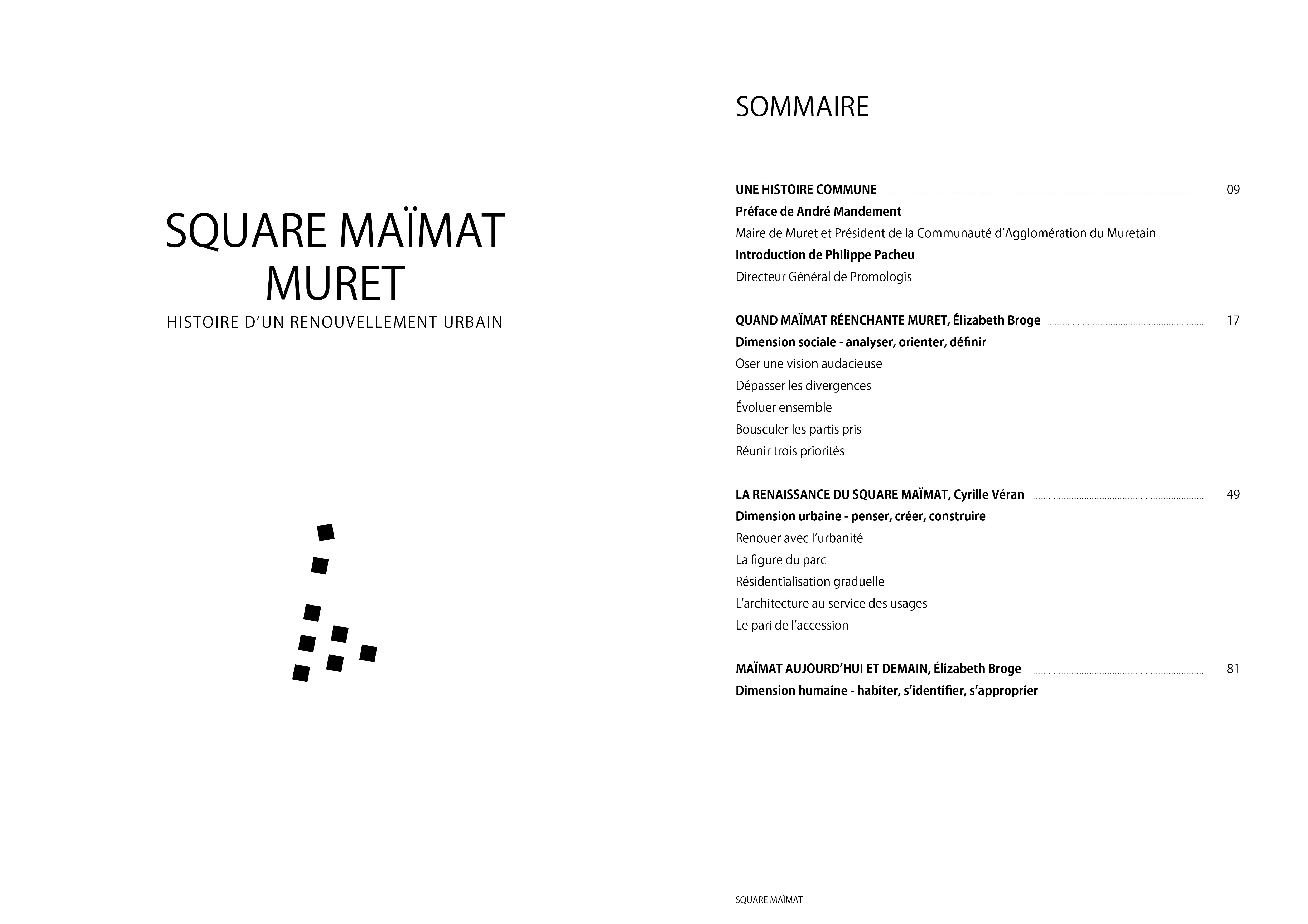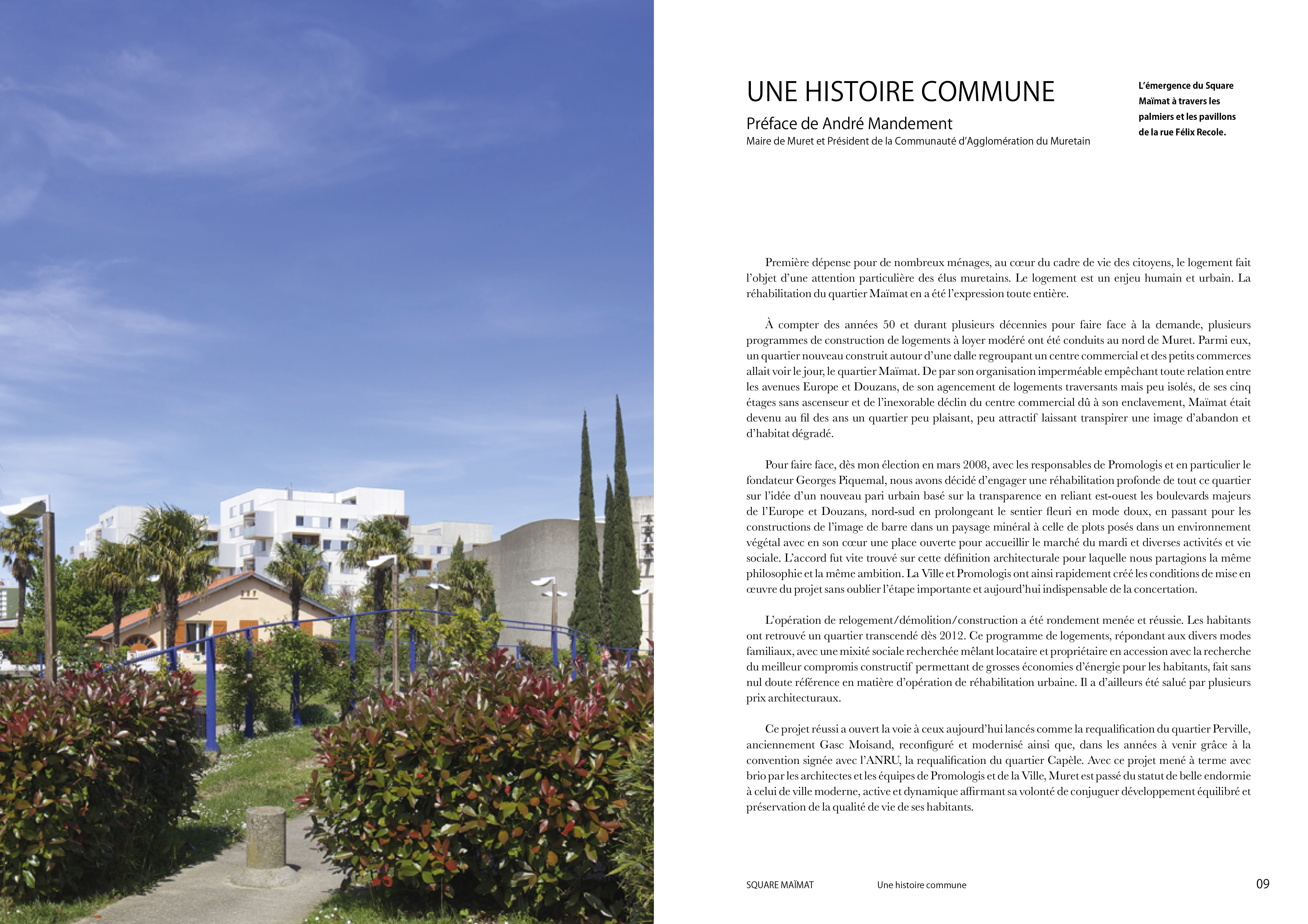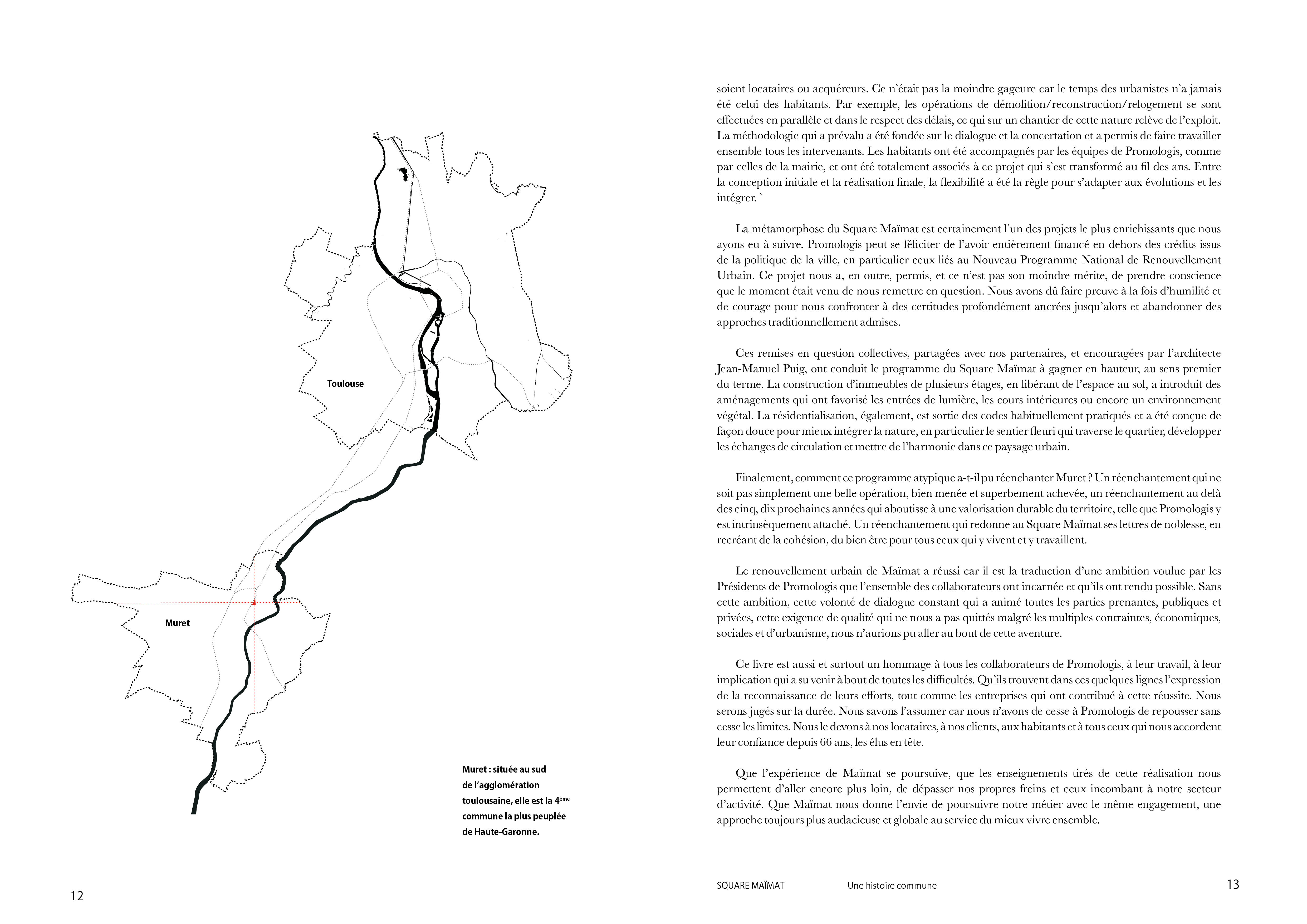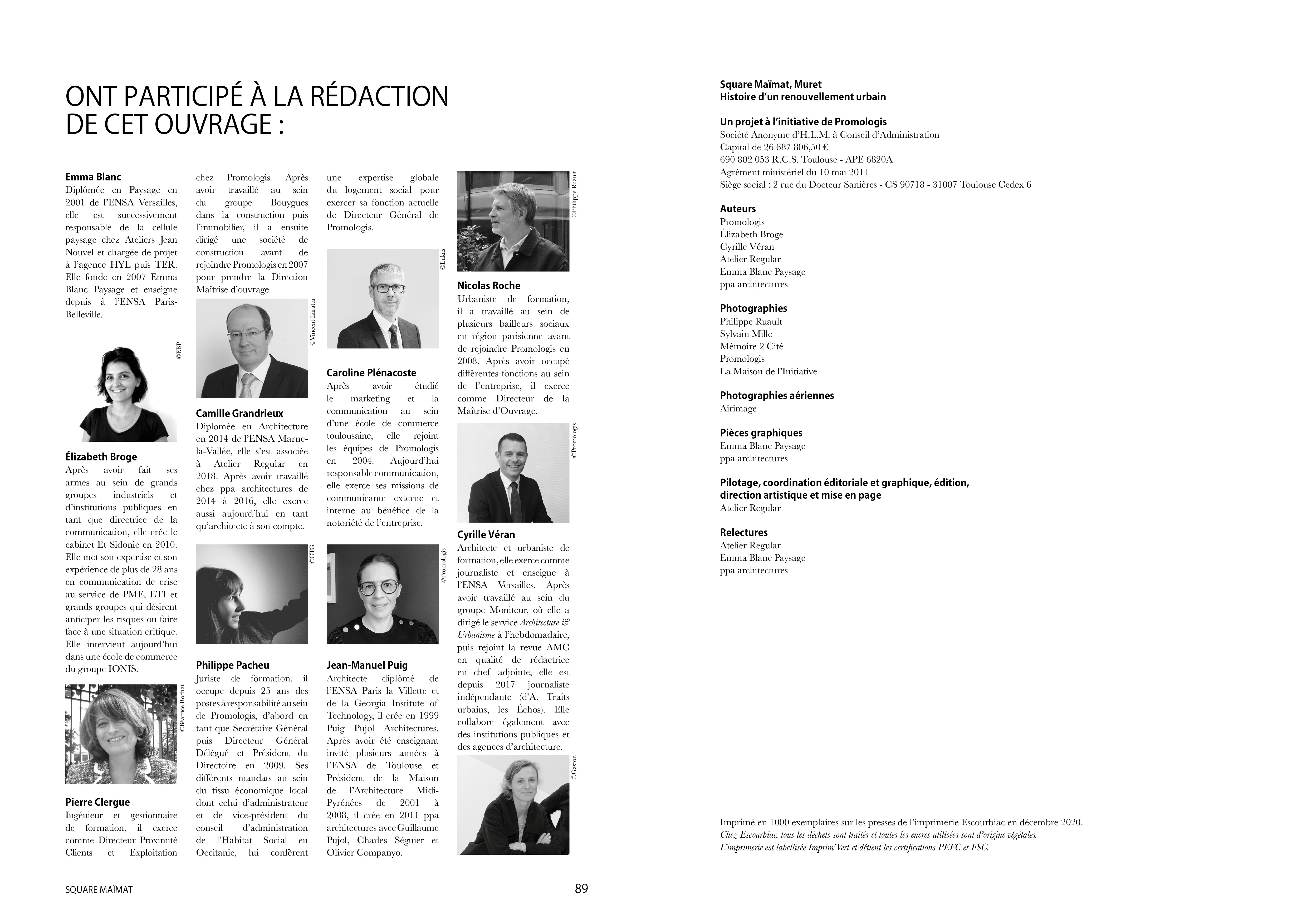 « Monographie de projet », commanditée par le bailleur social Occitan Promologis, cet ouvrage a été conçu par nos soins avec l’aide précieuse de rédactrices spécialisées (Cyrile Véran, ancienne rédactrice en chef de la revue Le Moniteur et Elizabeth Broge, ancienne directrice de la communication de l’ANRU), mais aussi au travers d’interviews d’habitants et d’occupants.