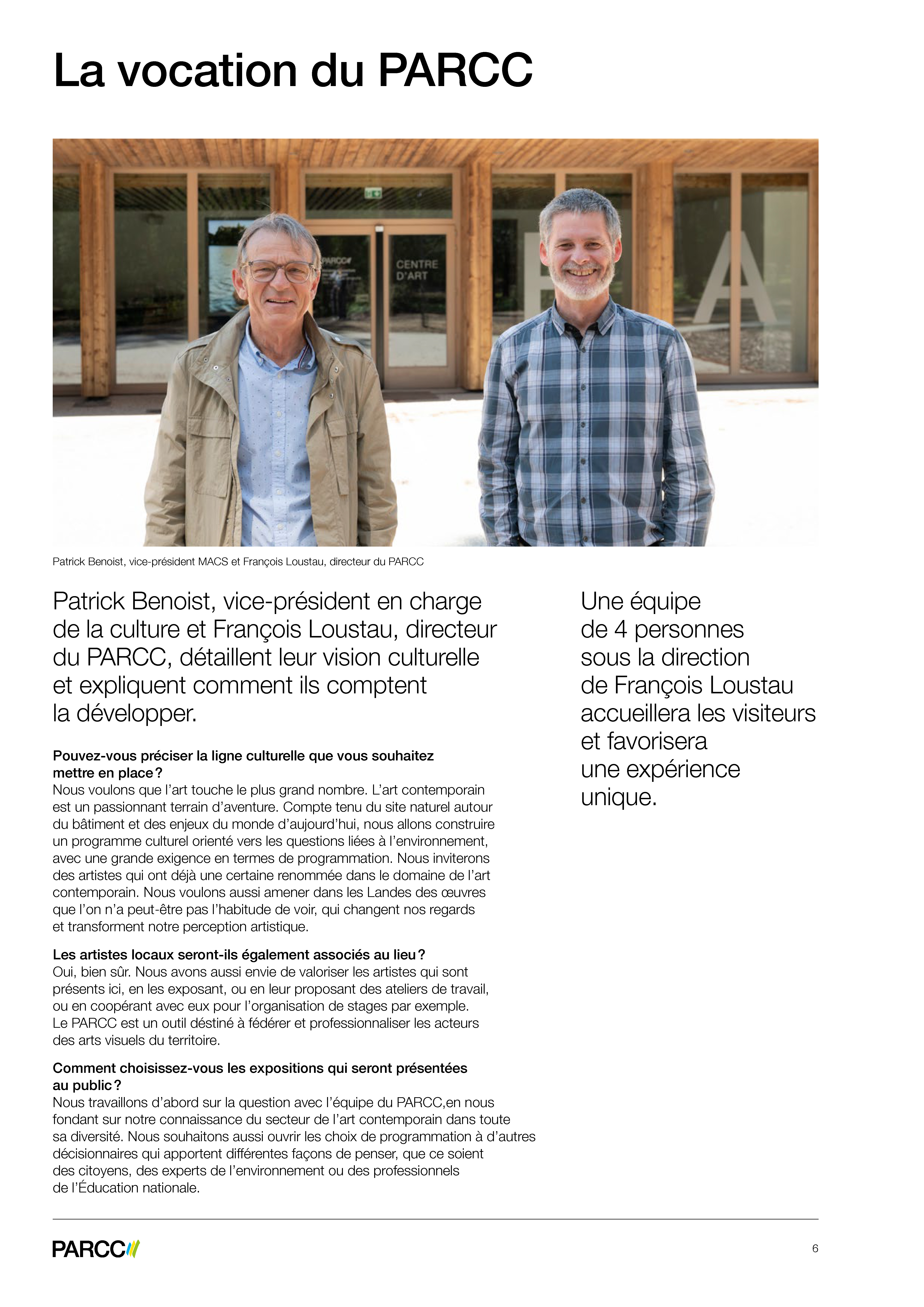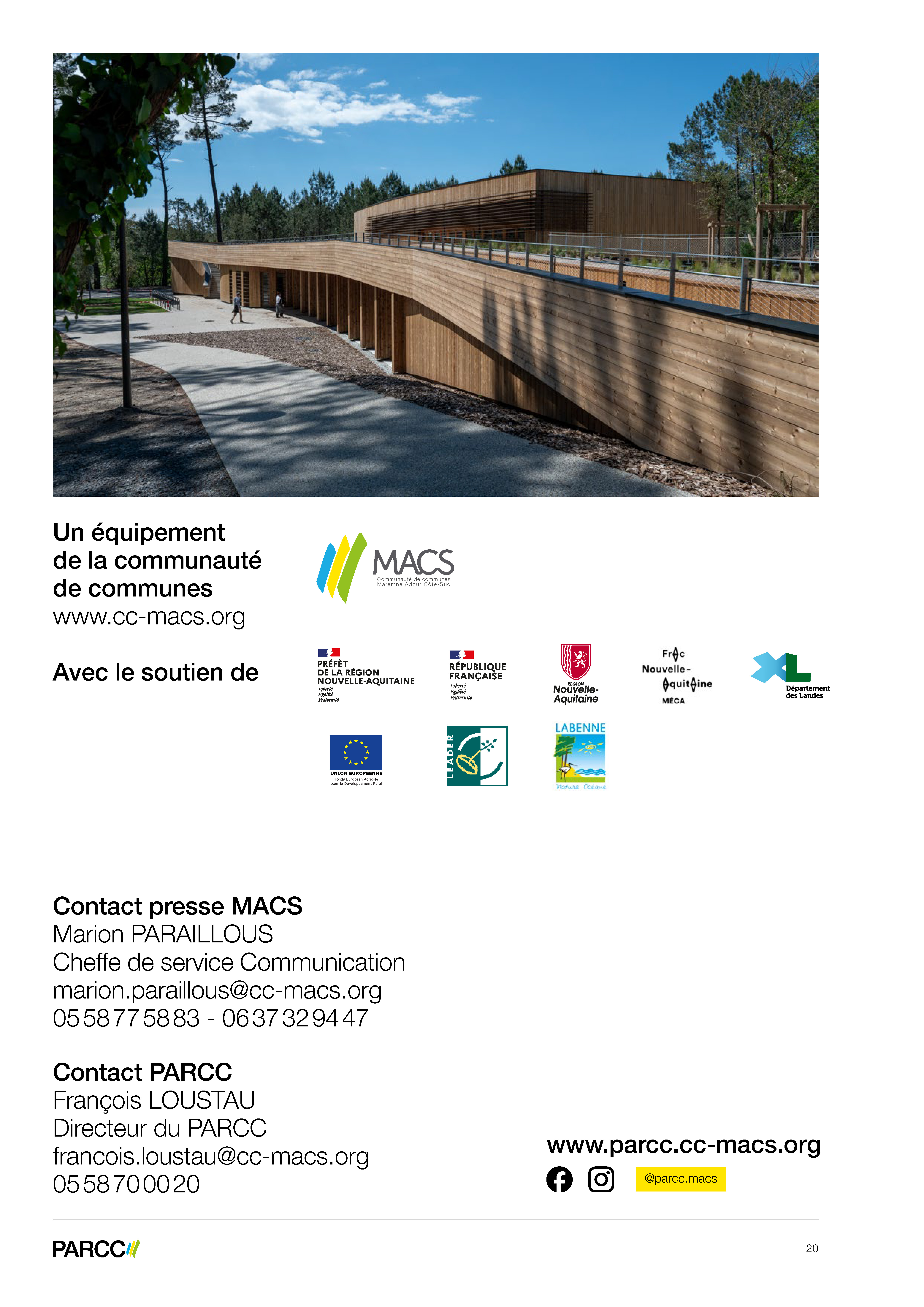 Le PARCC, Pôle Artistique Créatif Contemporain, a ouvert ses portes le 8 juin 2024. Cet équipement de la Communauté de Communes MACS, situé à Labenne, au milieu d’une forêt, adossé à une dune, tisse des liens étroits entre création actuelle et transition écologique.