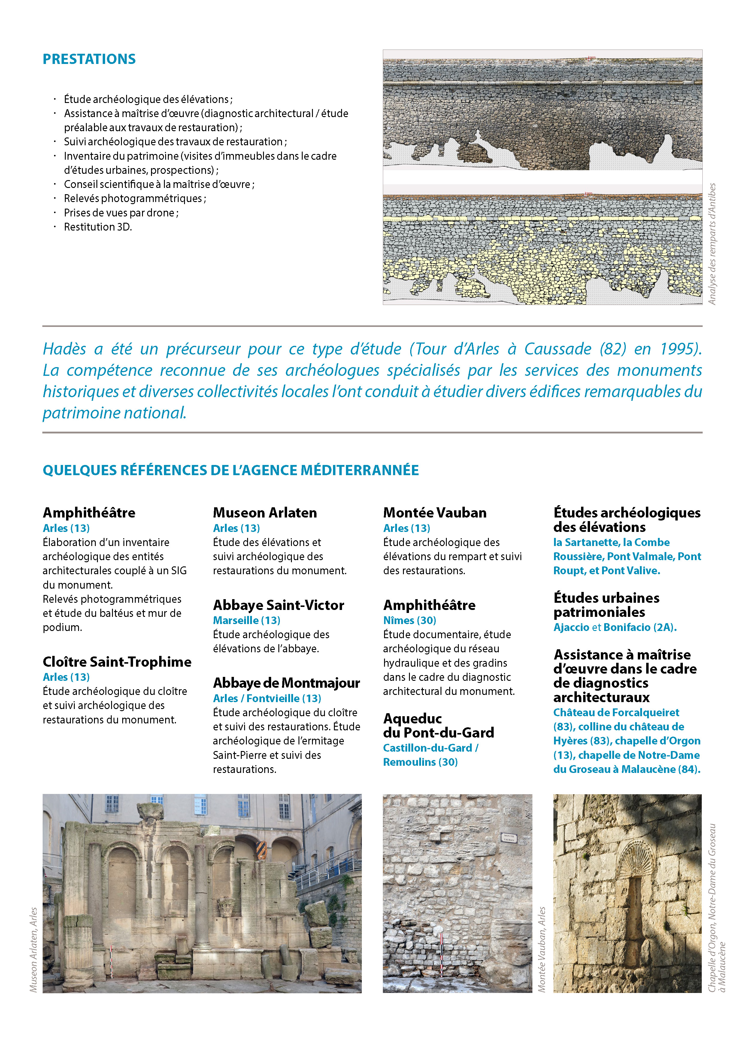 Le bureau d’investigations archéologiques Hadès recherchait un partenaire pour l’accompagner sur la stratégie et le développement de sa communication. Souhaitant collaborer avec une SCOP, ils ont sélectionné Atelier Regular pour cette passionnante mission. Nous avons travaillé en collaboration avec la direction à la conception de maquettes pour les fiches des agences et pour les fiches compétences. Nous avons décliné ces maquettes en collaboration avec les équipes opérationnelles pour la conception de la nouvelle fiche présentant l’agence Méditerranée à Arles ainsi que 3 fiches compétences (SIG, Systèmes d’Informations Géographiques - Archéologie des élévations - HArpage).