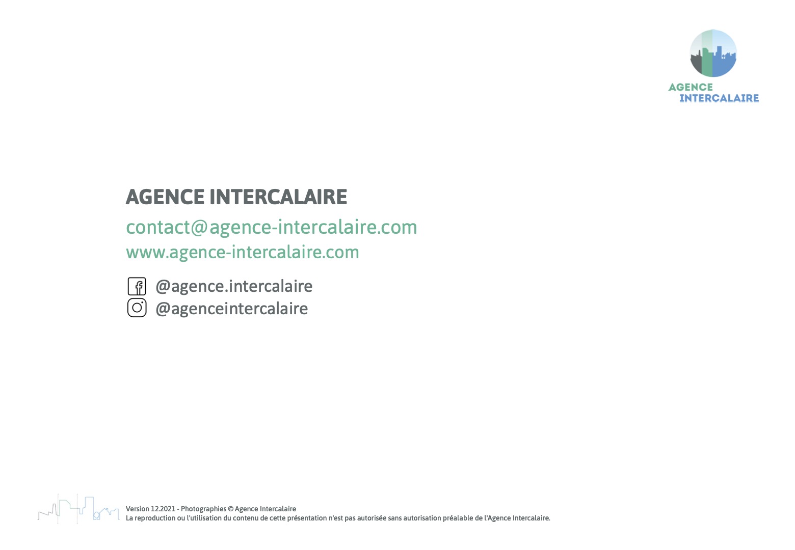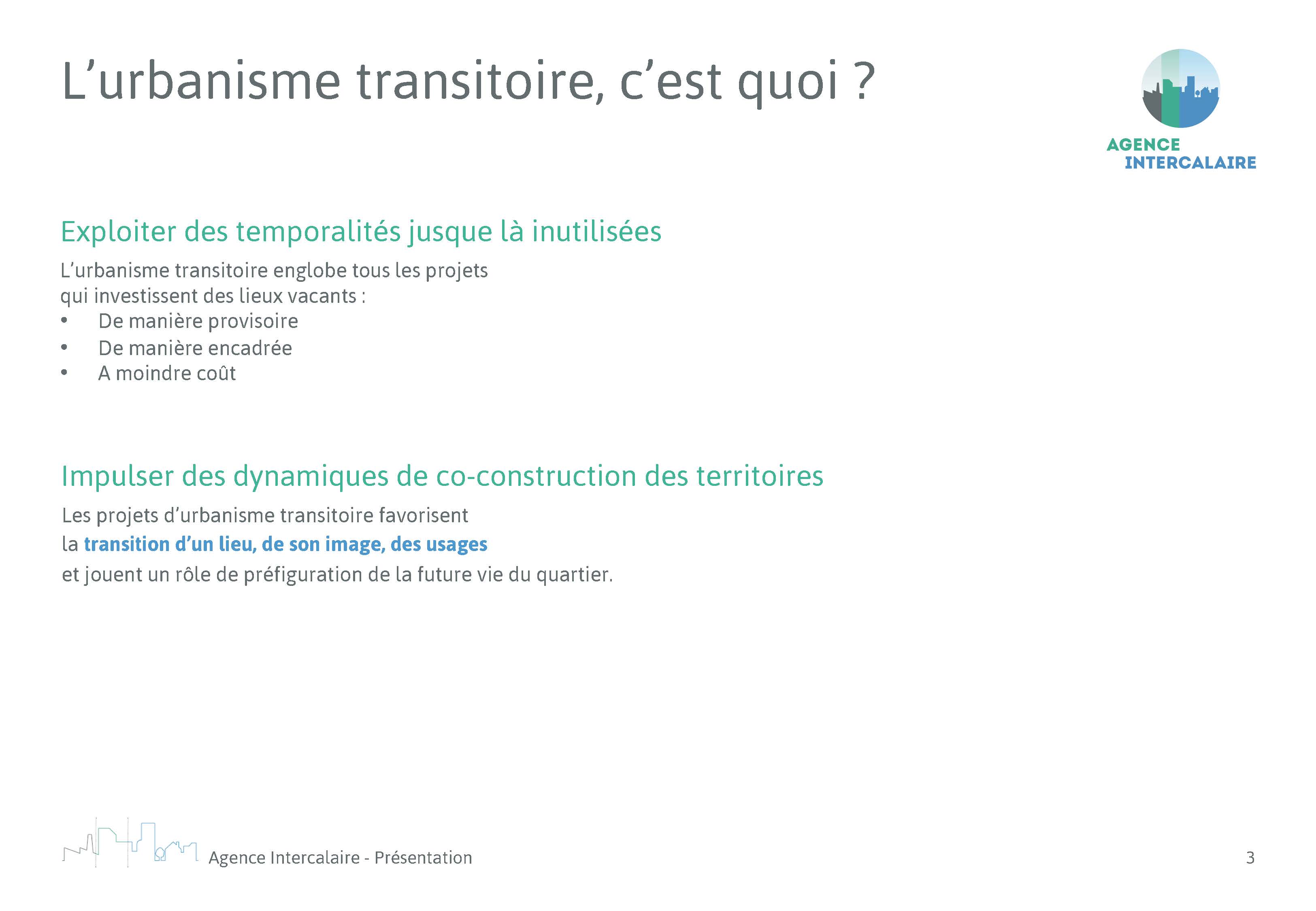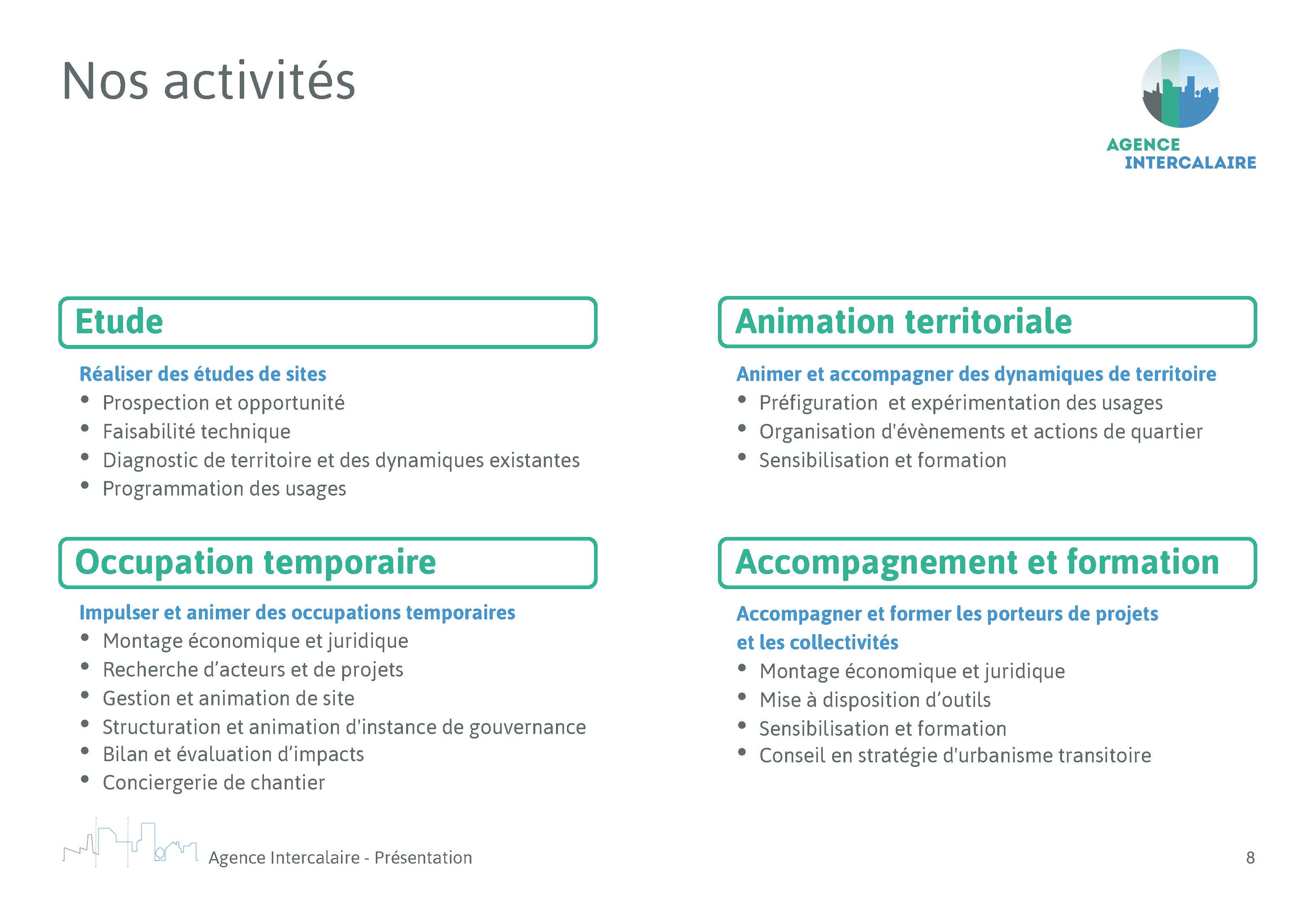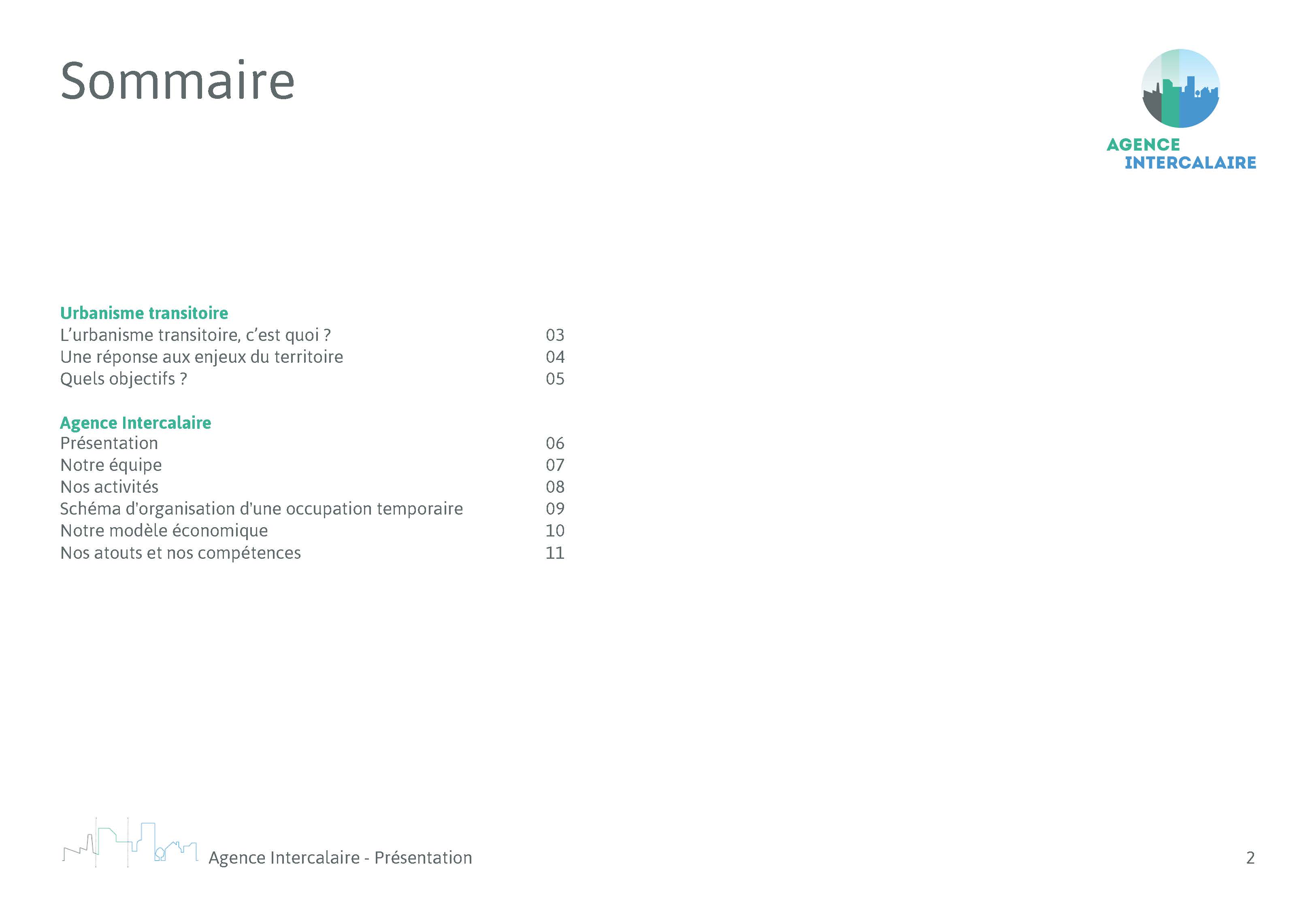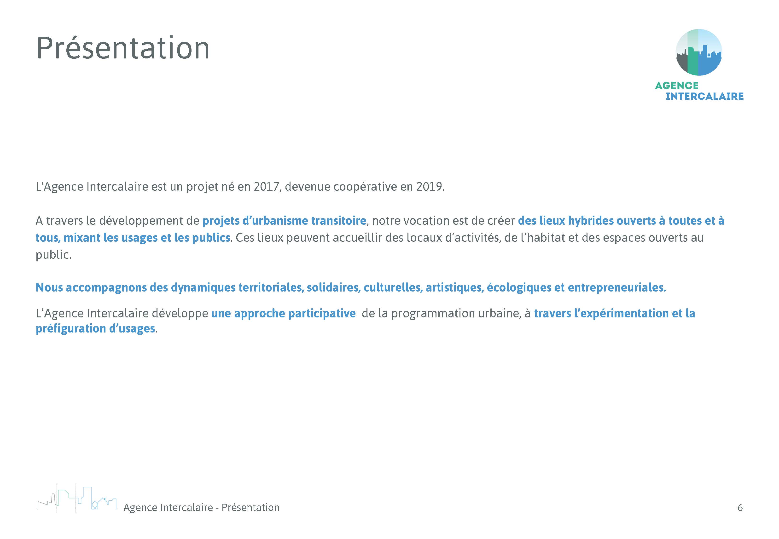 L’Agence Intercalaire, spécialisée dans l’urbanisme transitoire, nous a confié la mission de refonte de son document de présentation générale et de ses références. Nous avons utilisé la charte graphique existante et avons travaillé sur une commande complémentaire en concevant un modèle commenté sur power-point afin de leur permettre de produire de nouveaux supports dans la même ligne graphique et d’optimiser ainsi le temps de conception et l’autonomie pour les futures mises à jour.