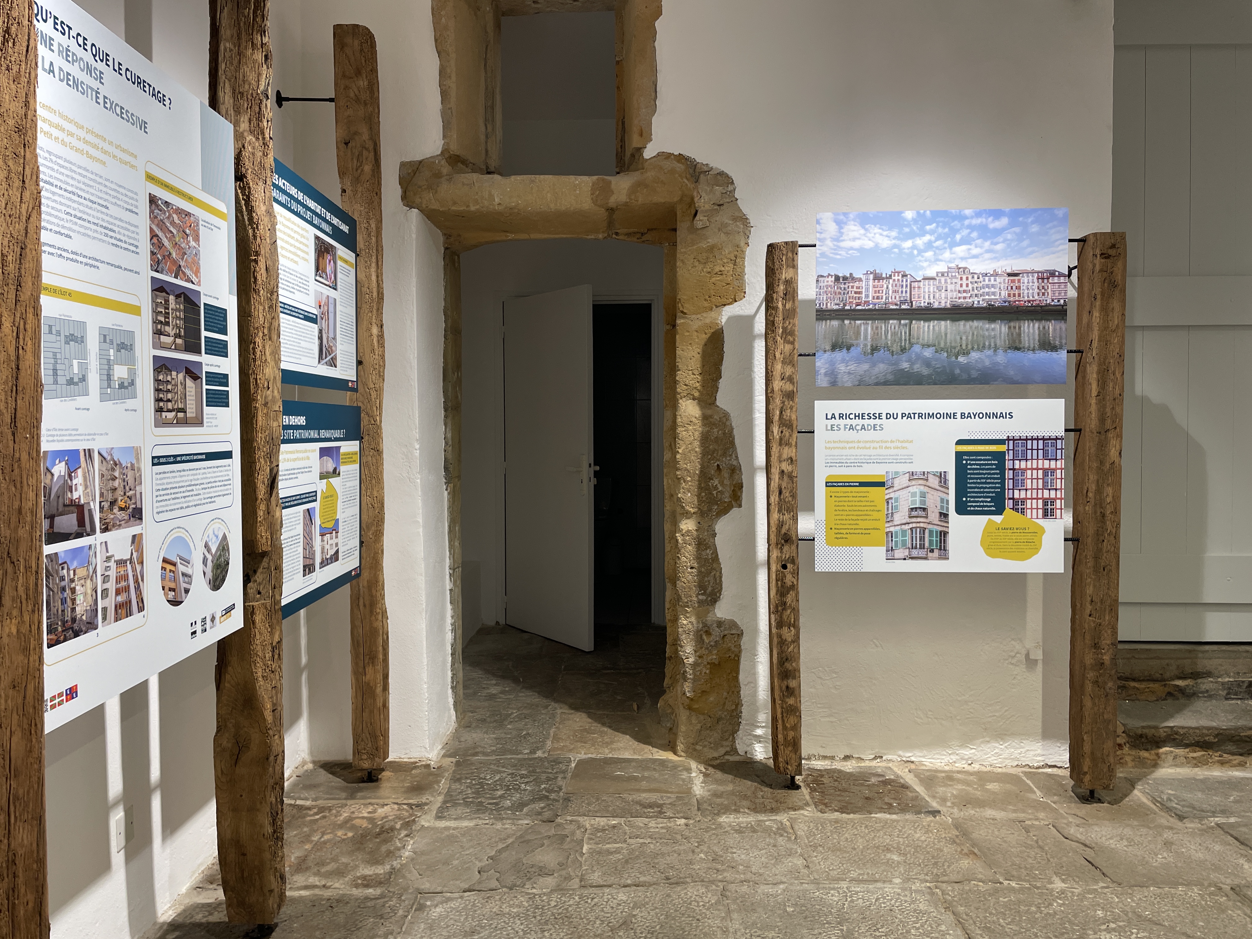Nous avons réalisé avec l’agence d’architecture Formalocal la scénographie de l’exposition pédagogique et technique consacrée au patrimoine bâti bayonnais présentée à la Boutique du Patrimoine et de l’Habitat. Notre équipe était en charge de la conception et du suivi de réalisation de l’ensemble des supports de l’exposition : dispositif scénographique, dessin du mobilier, conception graphique des panneaux.