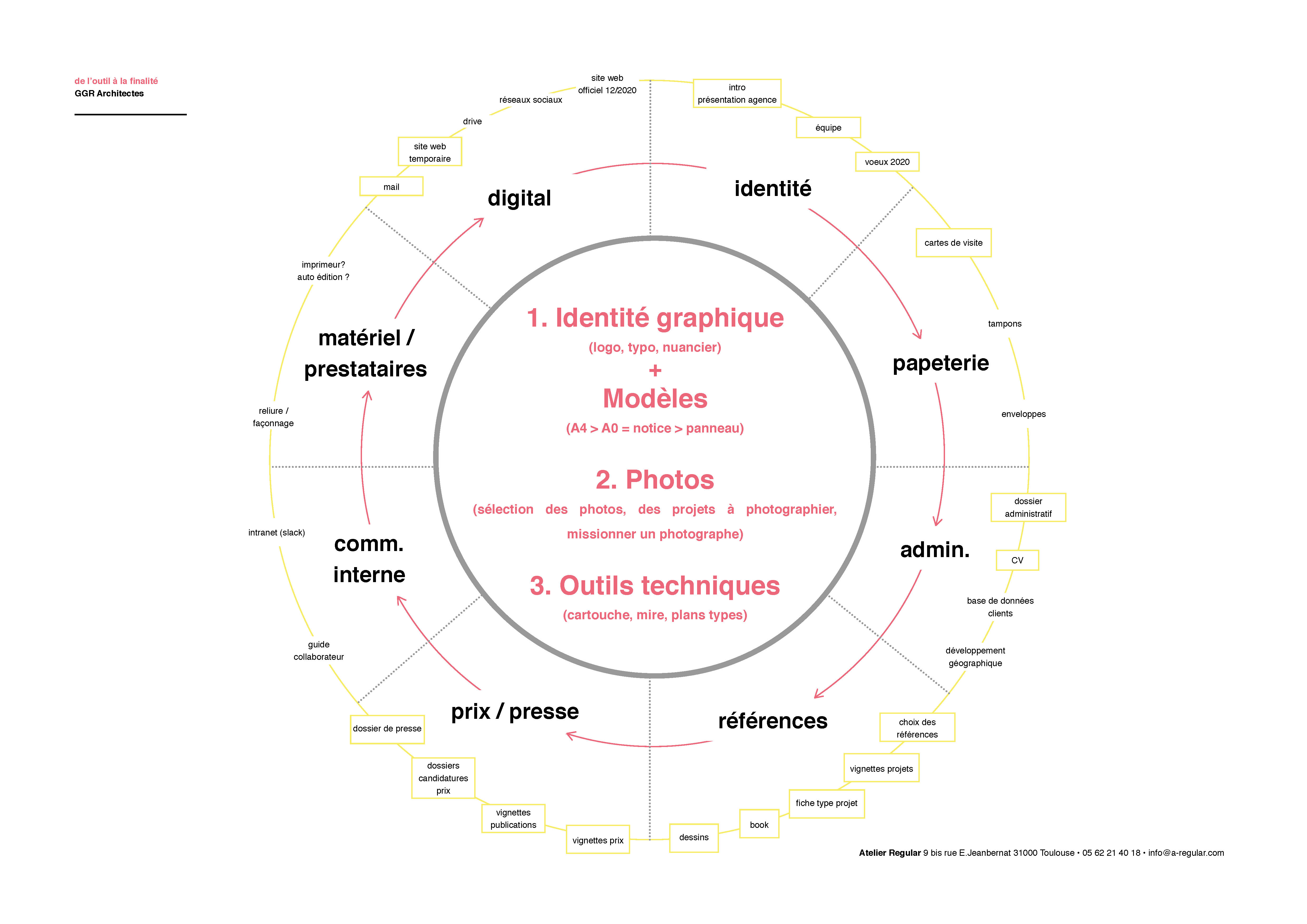 Analyse des supports et outils de communication. Audit positionnement général, méthodologie et philosophie de l’agence. Formalisation des besoins et du positionnement général. Proposition stratégique des actions de communication à mettre en place ou développer. Planification et estimation des moyens.
