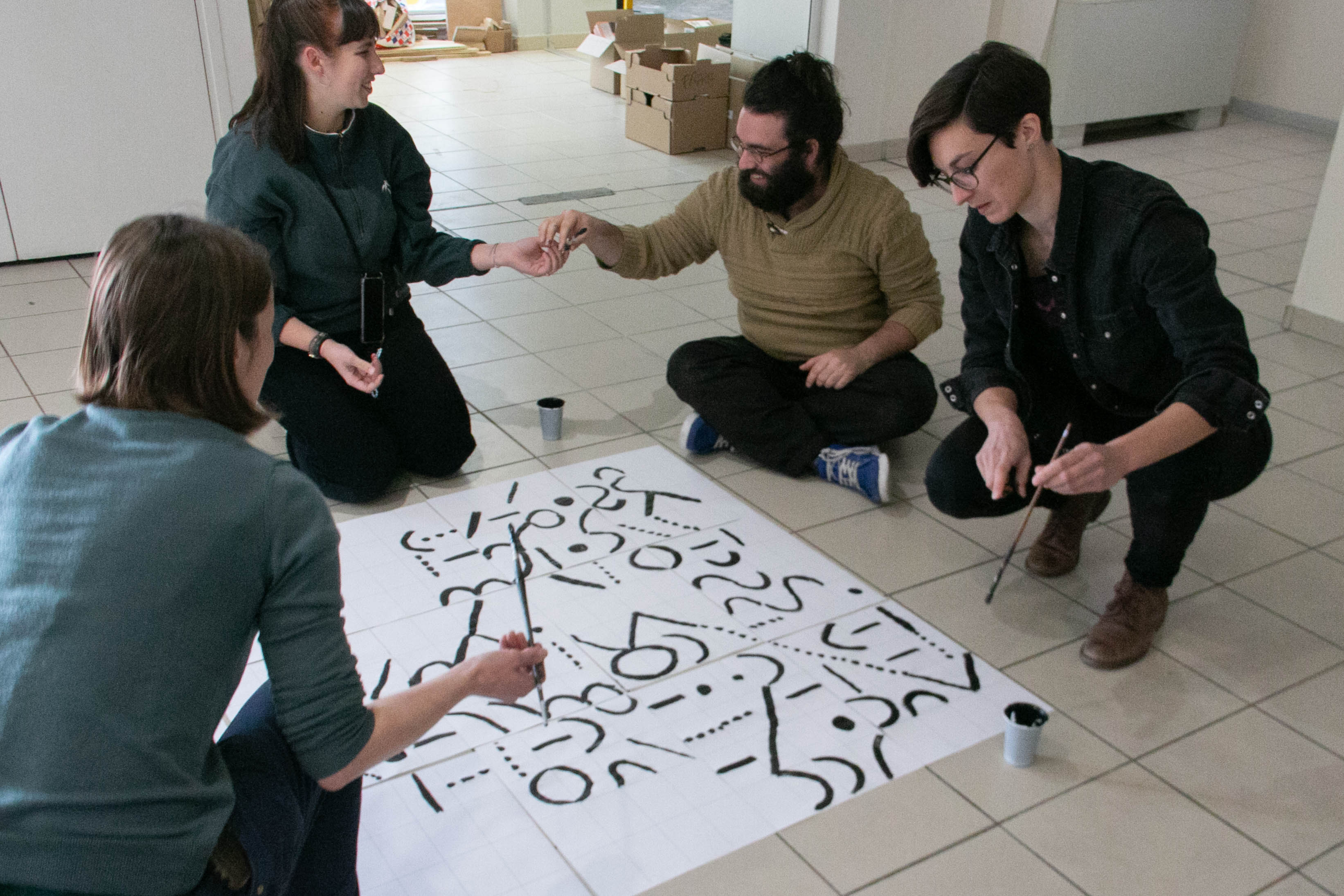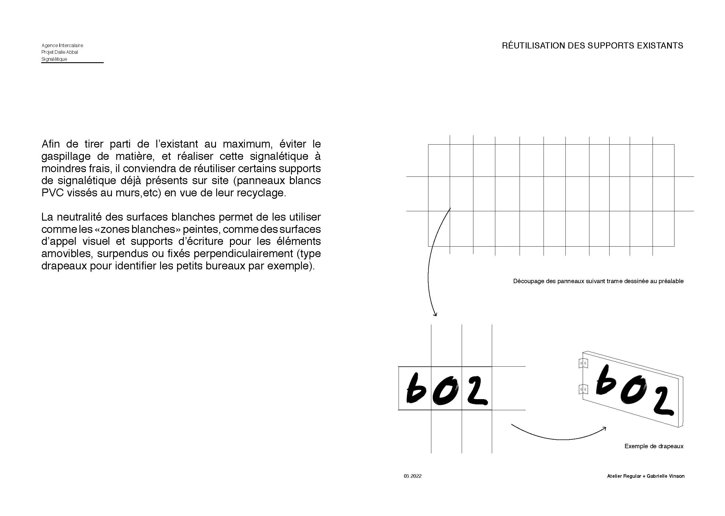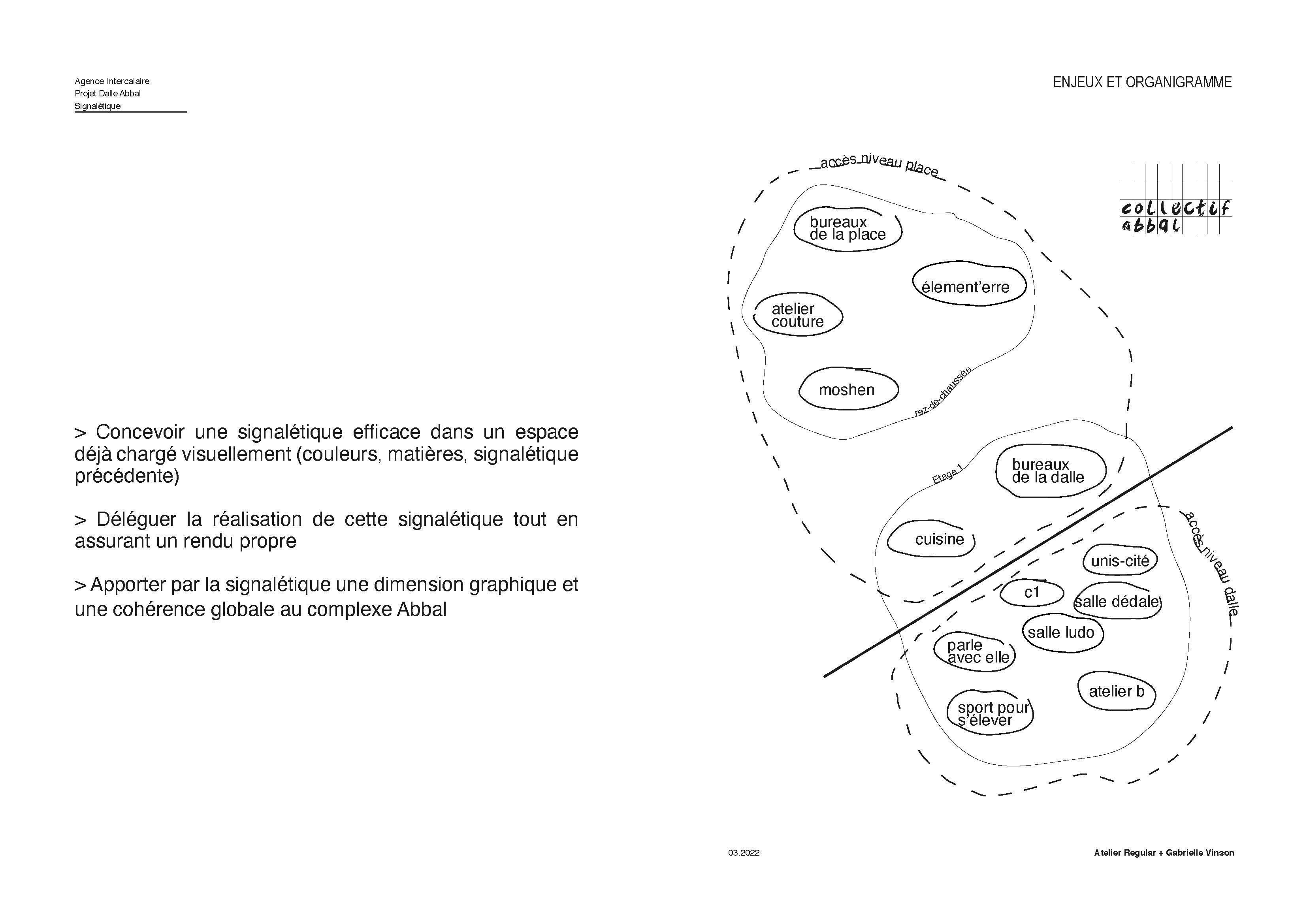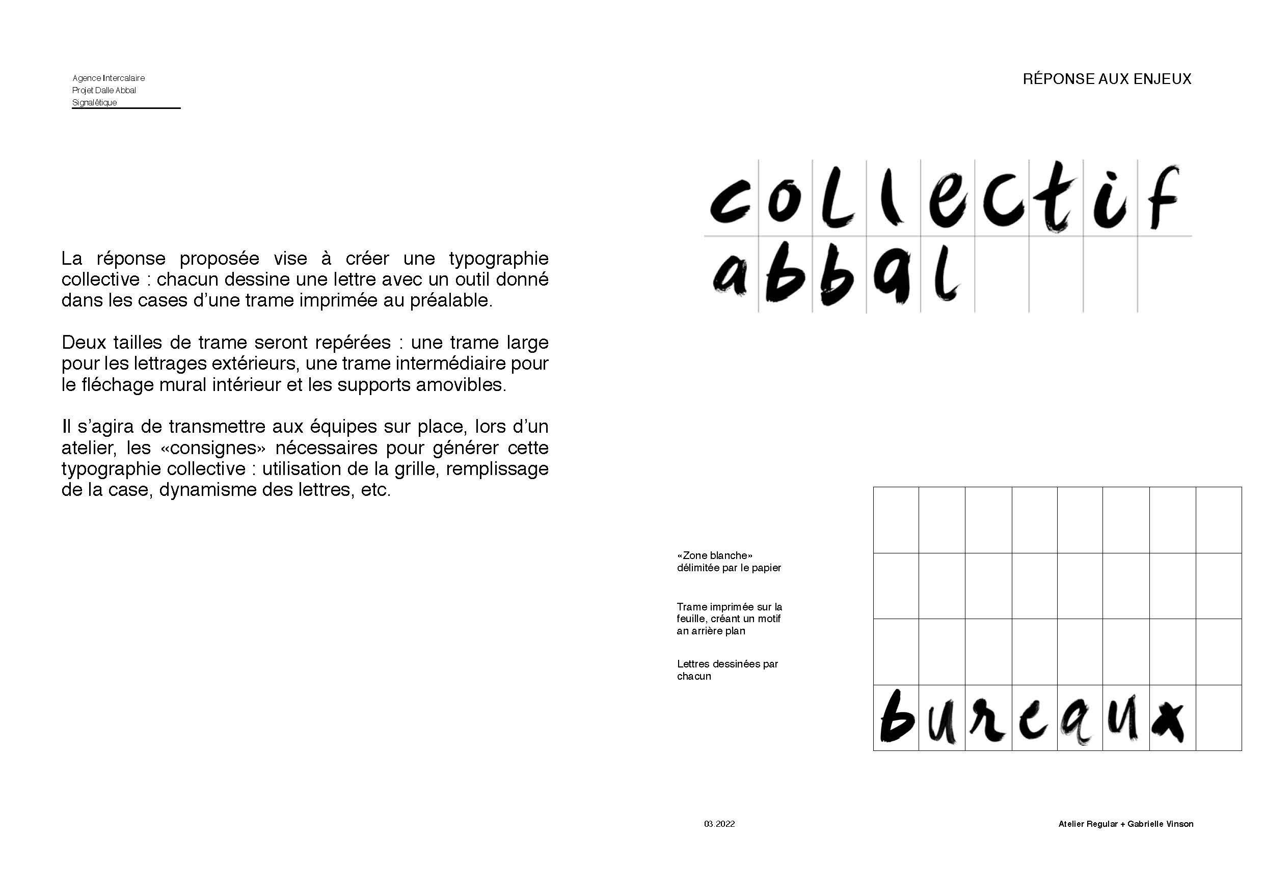 Suite à la conception de l’identité et de la charte graphique du Tiers-Lieu Collectif Abbal, l’Agence Intercalaire et le Collectif des Occupants de la Dalle Abbal nous ont confié la conception de la signalétique du Tiers-Lieu. Nous avons imaginé, avec Gabrielle Vinson, architecte/artiste, un projet participatif, mettant les occupants du lieu au cœur du dispositif de création et avons organisé des ateliers sur place afin de transmettre une méthodologie de mise en place de la signalétique.