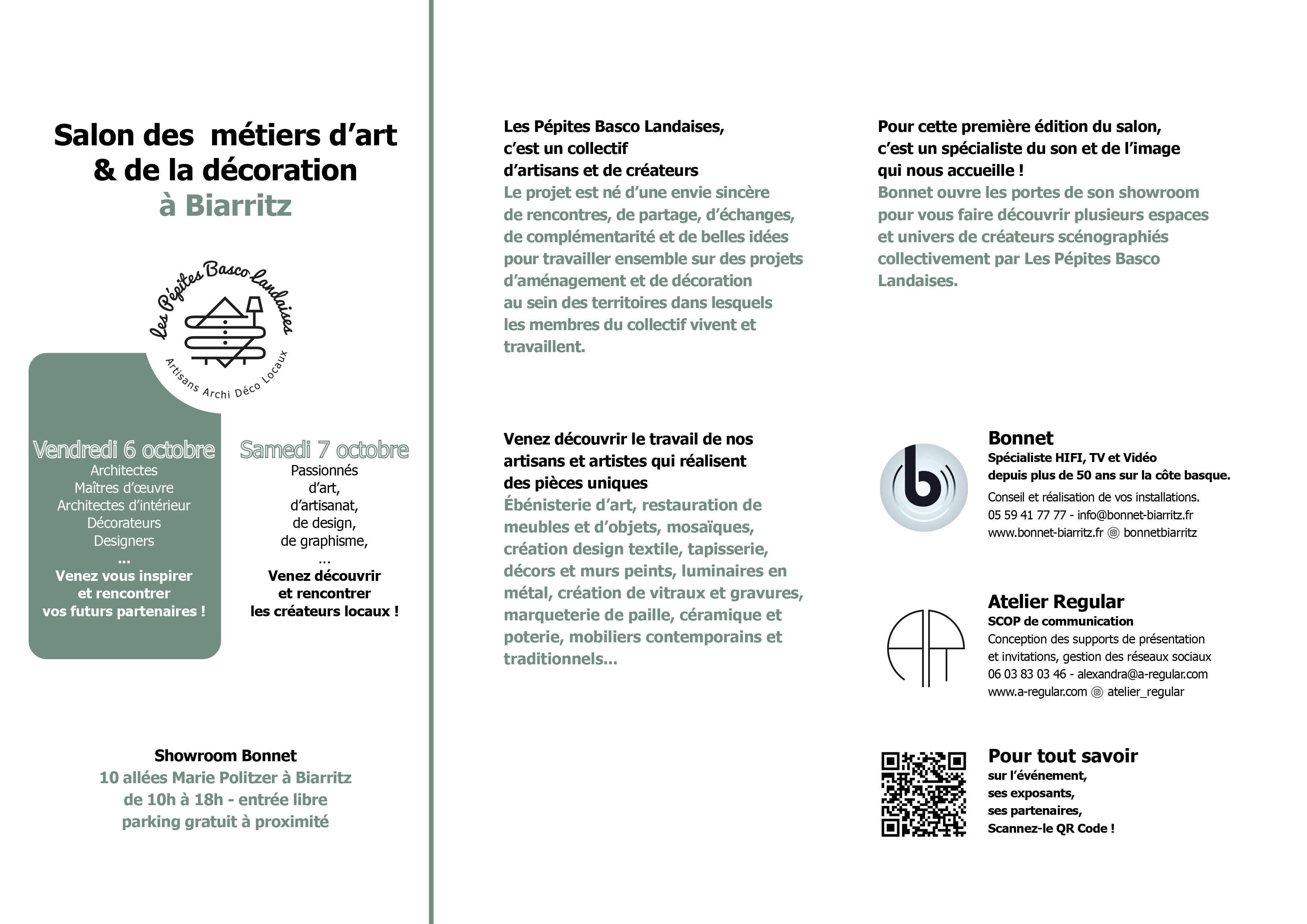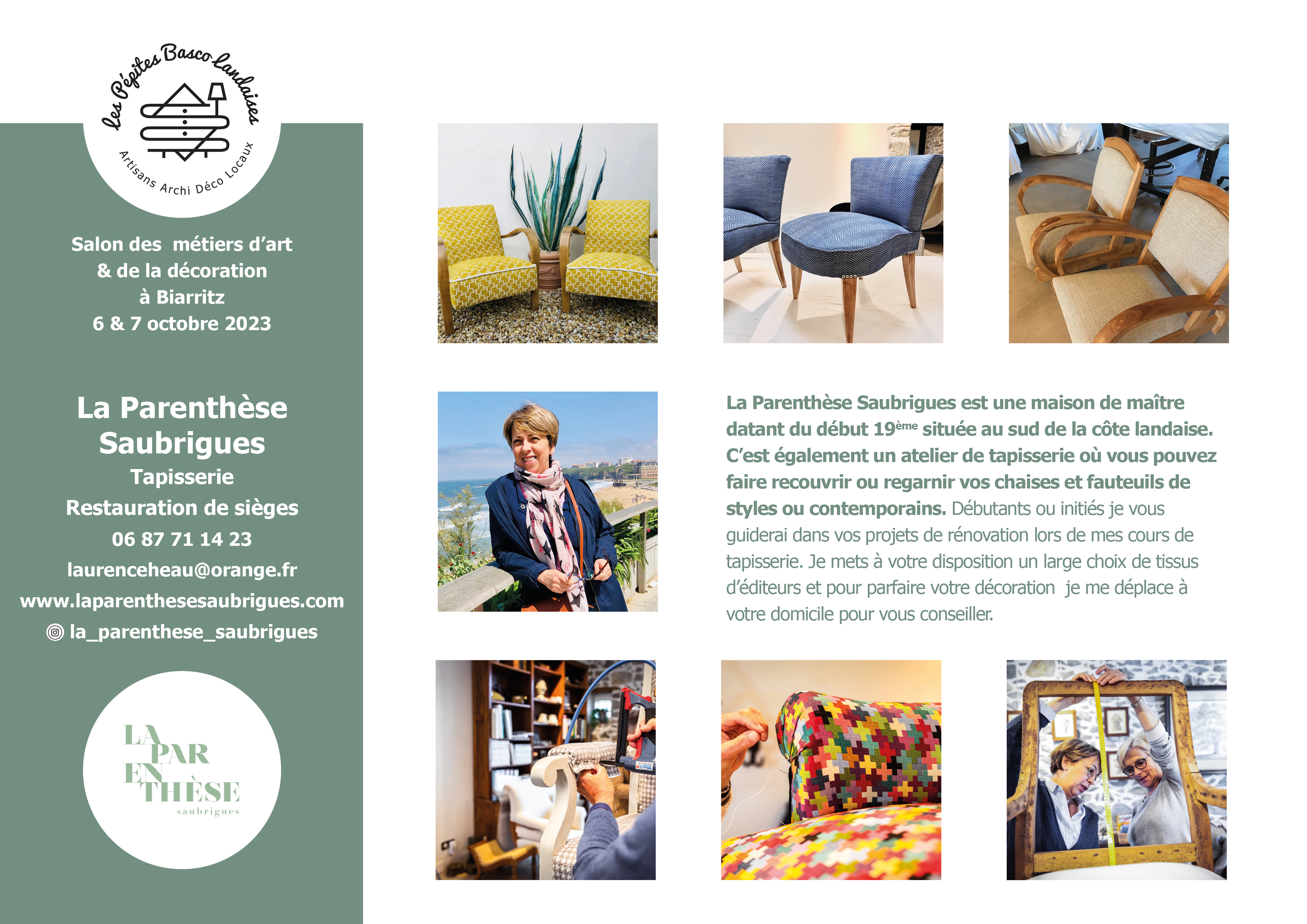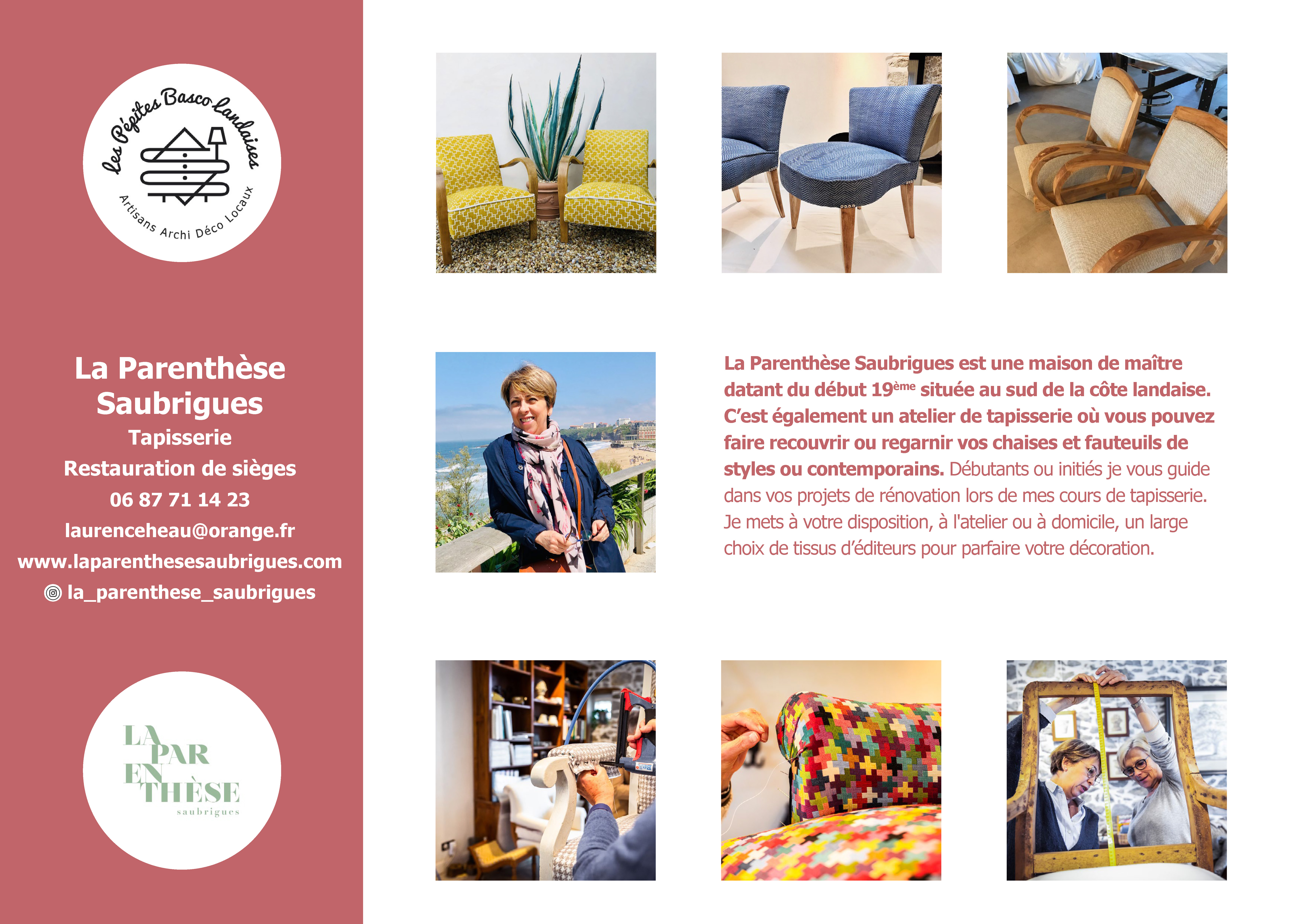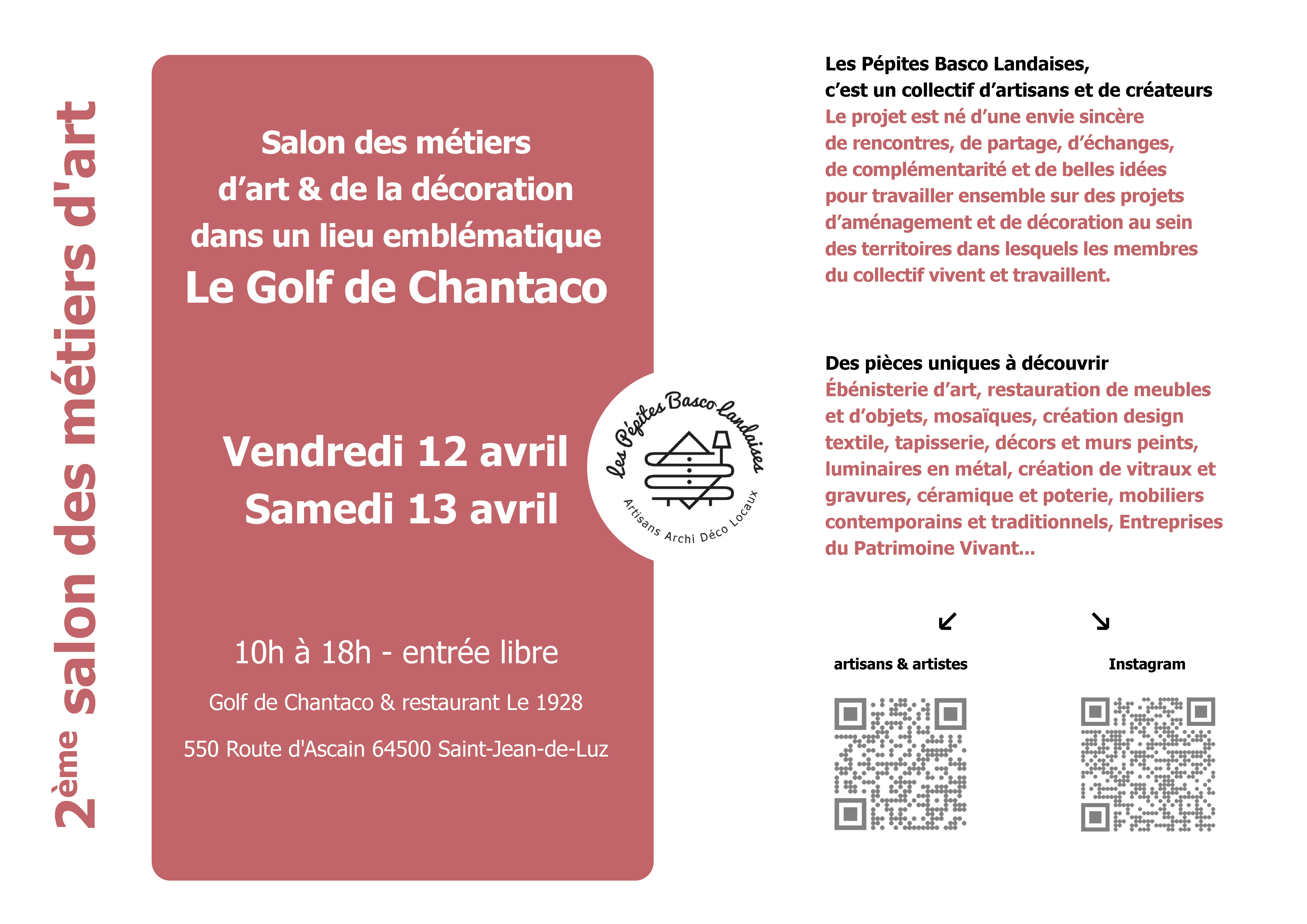 Les Pépites Basco Landaises c’est un collectif d’artisans et d’artistes. Le projet est né d’une envie sincère de rencontres, de partage, d’échanges, de complémentarité et de belles idées pour travailler ensemble sur des projets d’aménagement et de décoration au sein des territoires dans lesquels les membres du collectif vivent et travaillent. Différentes disciplines sont présentées, dont deux maisons labellisées Entreprise du Patrimoine Vivant : la Chaiserie Landaise et Bosc les Landes.
