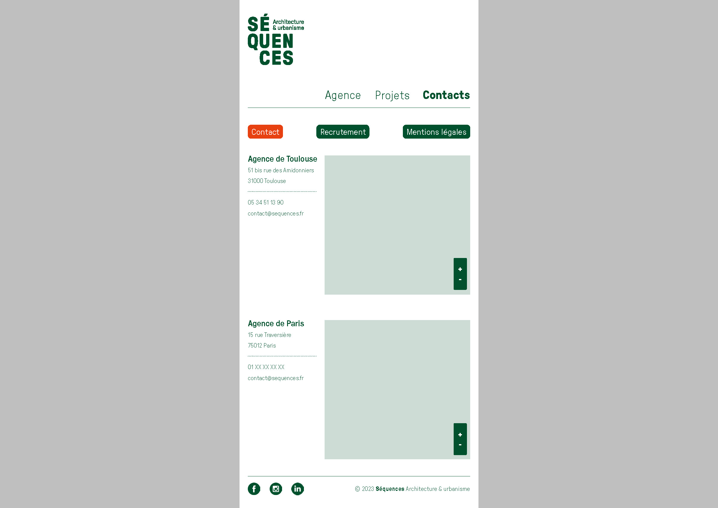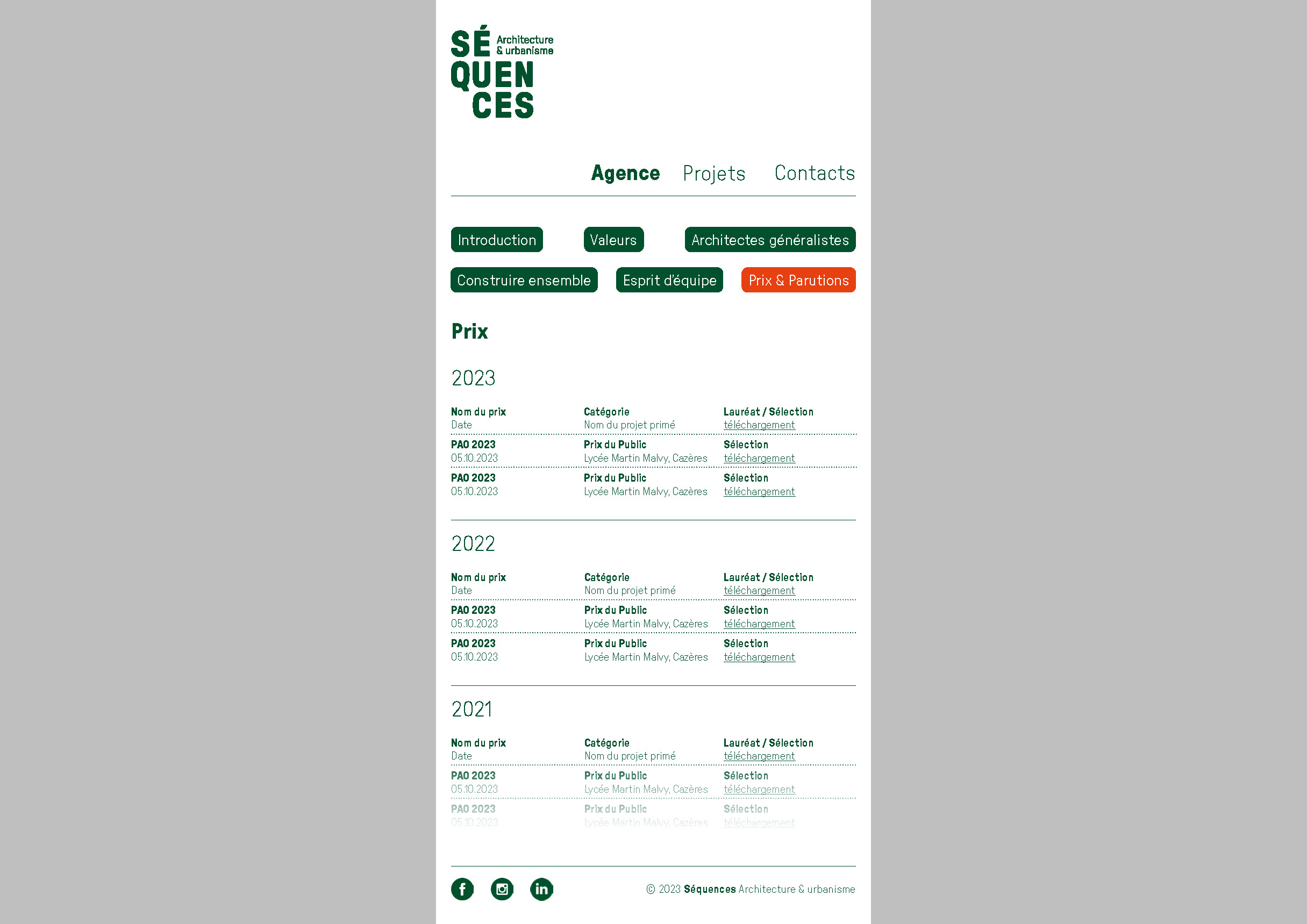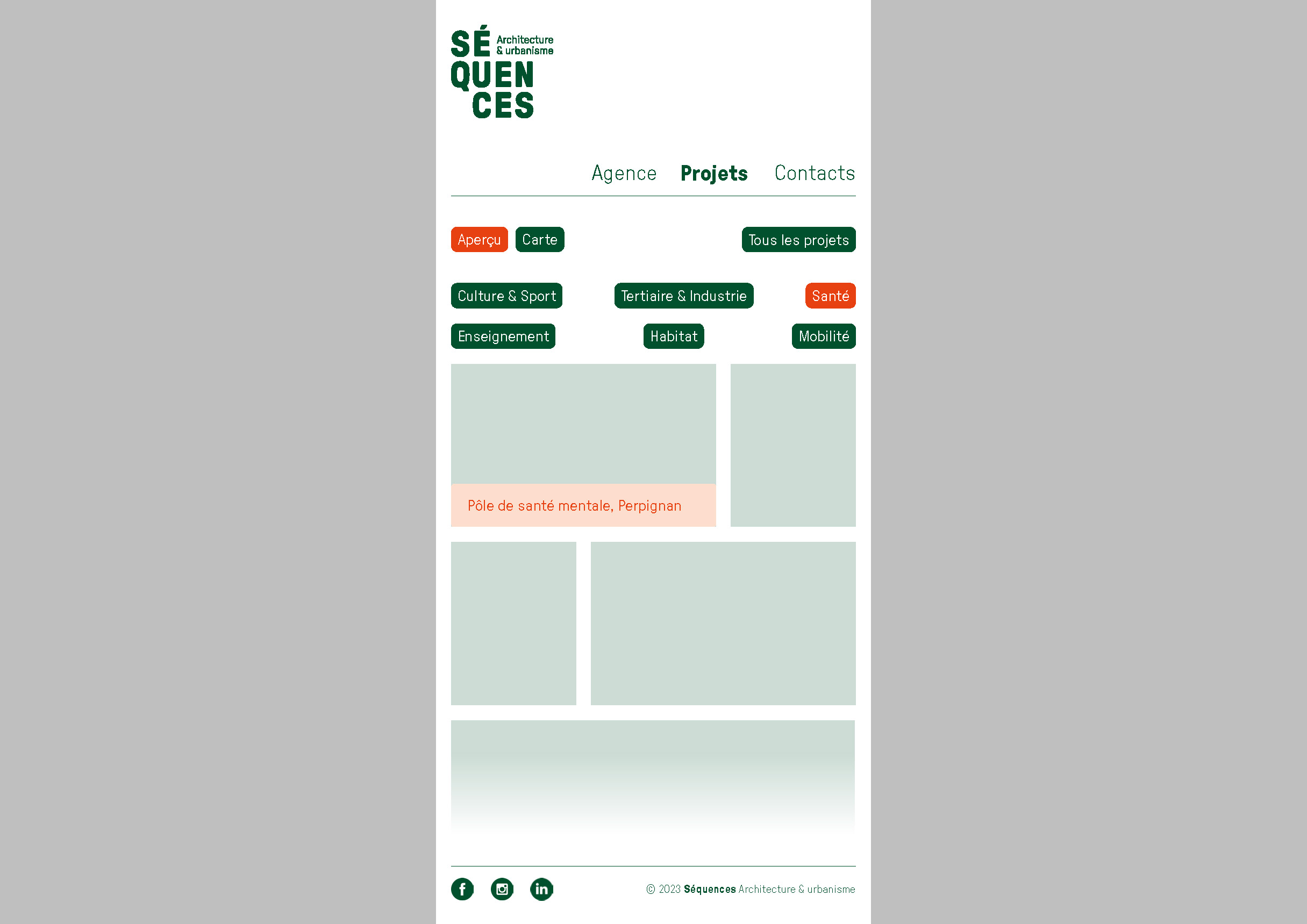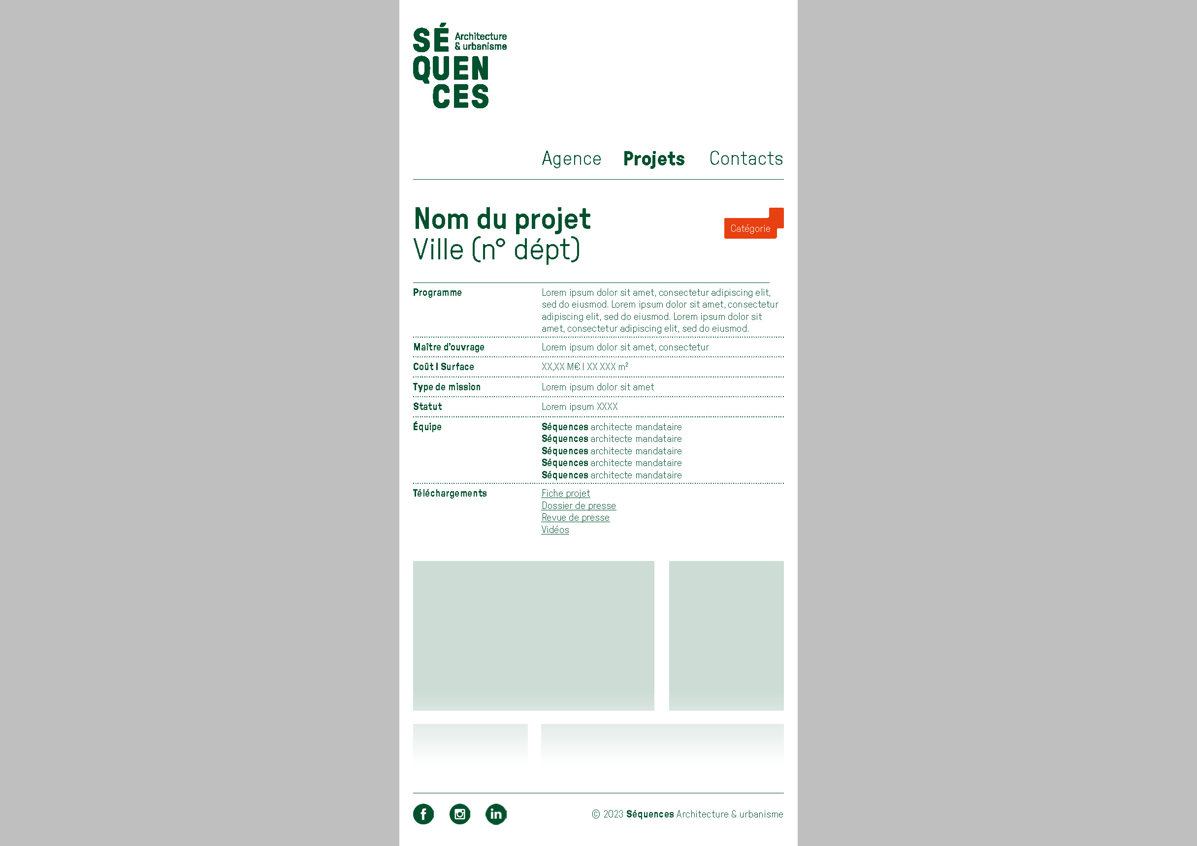 L’agence d’architecture et d’urbanisme Séquences nous a confié un diagnostic de l’ensemble de ses supports de communication existants qui a mené, en premier lieu, à la refonte totale de l’identité visuelle. Nous avons ensuite lancé la refonte du site internet et l’établissement de nouveaux outils digitaux tels que la possibilité d’éditer les fiches références et les listes de vignettes directement depuis le site. Nous avons dirigé ces missions et coordonné l’ensemble des phases de conception et de production. La conception graphique est signée Laura Savignac. Le développement des outils digitaux, toujours en cours, est signé Lucas Sifoni. Nous avons créé les gabarits pour les fiches références et les vignettes en lien direct avec la nouvelle identité.